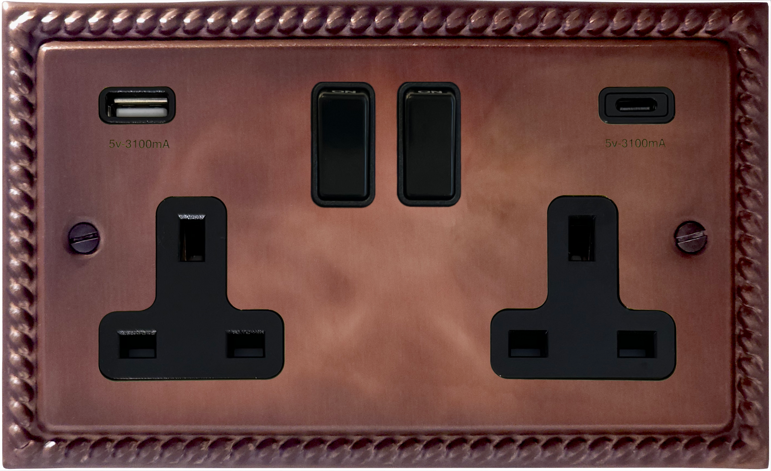Monarch Tarnished Copper Double Socket with USB (USB-A and USB-C/Black Switches) GE.911B.TC