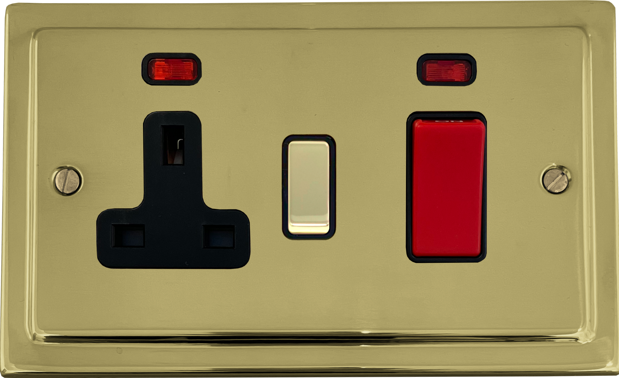 The switch is a red 45 amp cooker switch. The socket is a 13 amp socket with a polished brass switch. The switch surround and socket inserts are polished brass.