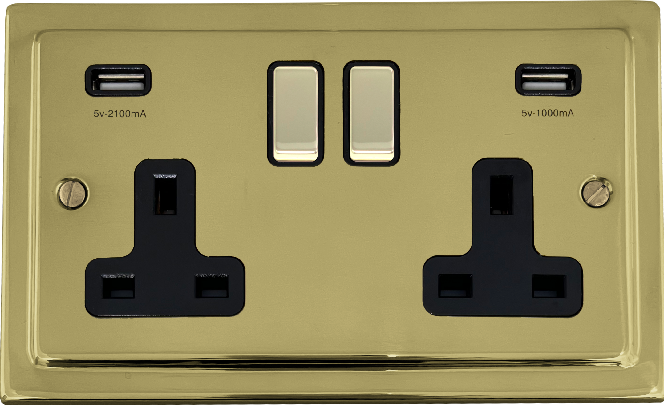 This is a 2 gang 13A switched socket with black inserts and black switches on a Victorian polished brass plate with USB.