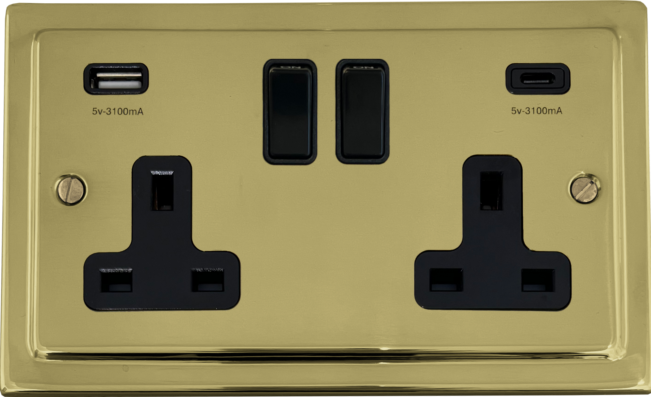 Polished Brass Double Socket with USB (USB-A and USB-C/Black Switches) VI.911B.B