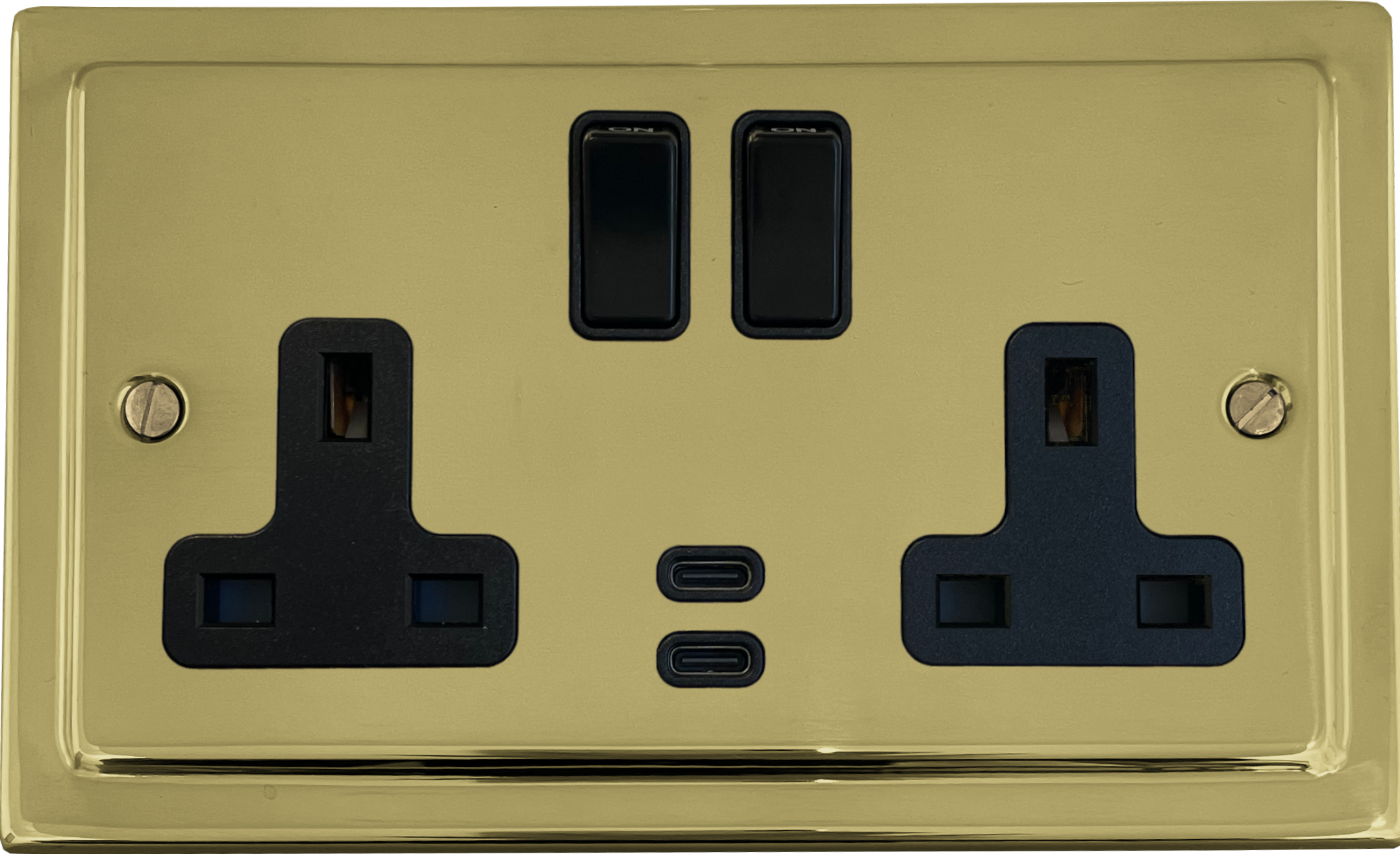 Polished Brass Double Socket with USB (USB-C/Black Switches) VI.913B.B