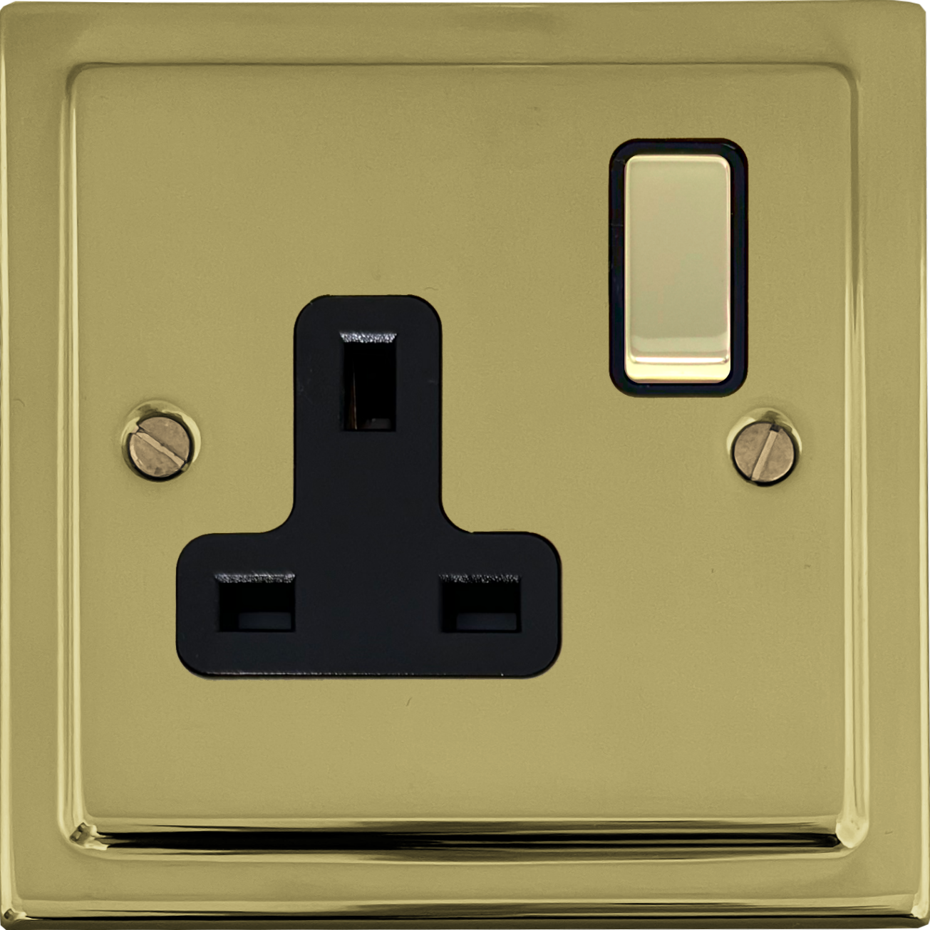This single switched socket with black inserts and a brass switch on a Victorian polished brass plate.
