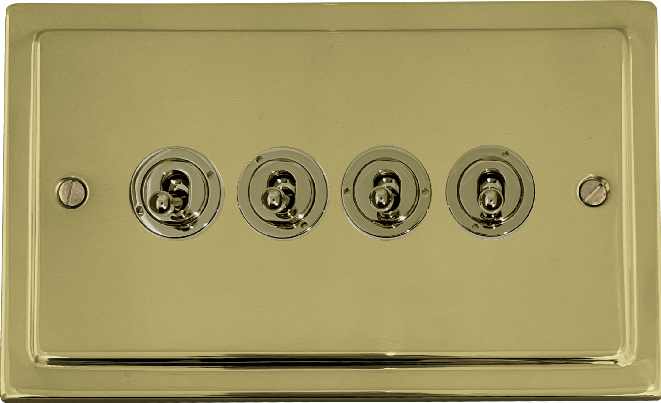 This is a 4 gang two way toggle switch on a Victorian polished brass plate.