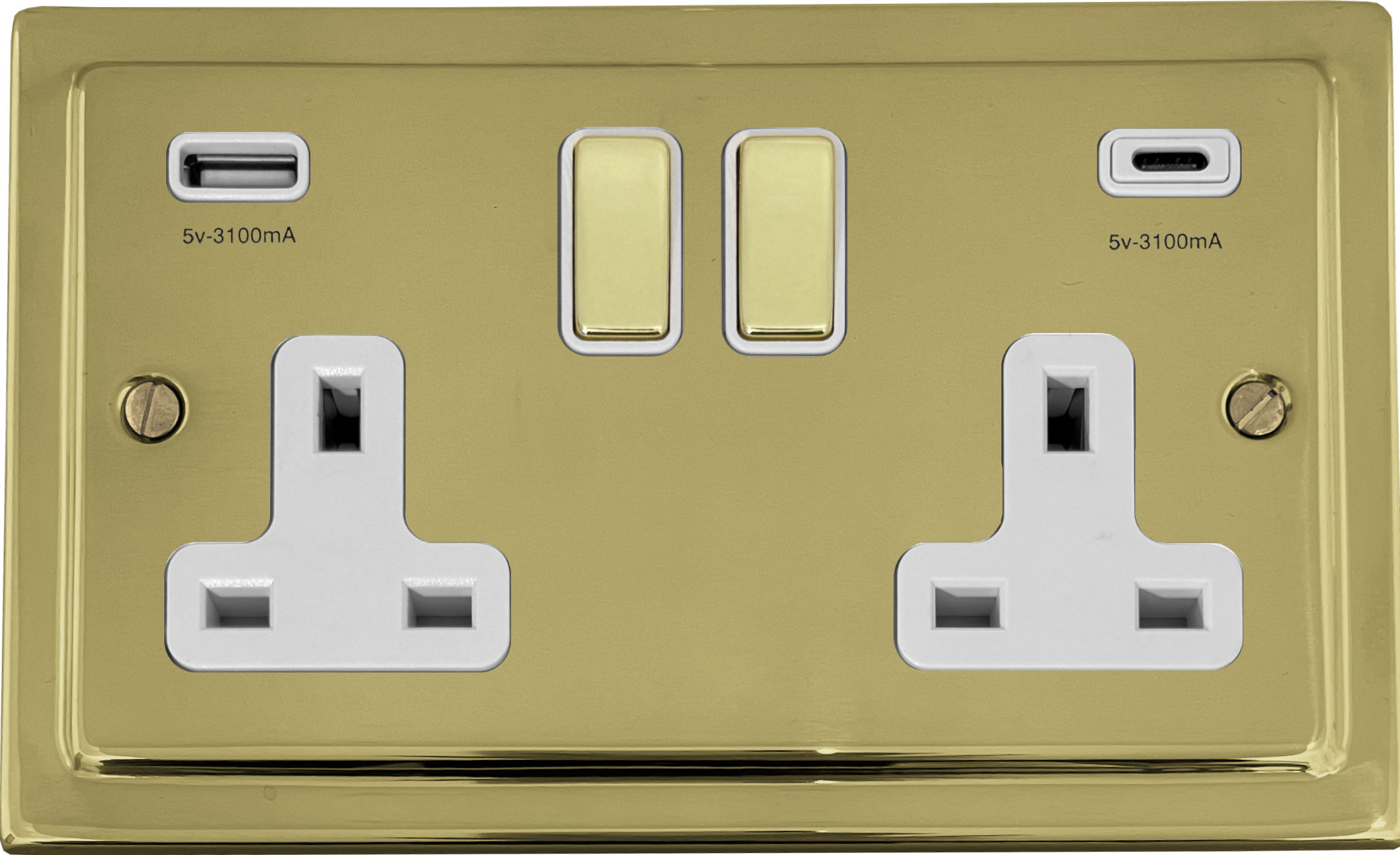 Polished Brass Unlaquered Double Socket with USB (USB-A and USB-C/White Inserts Brass Switches) - TBUL2911