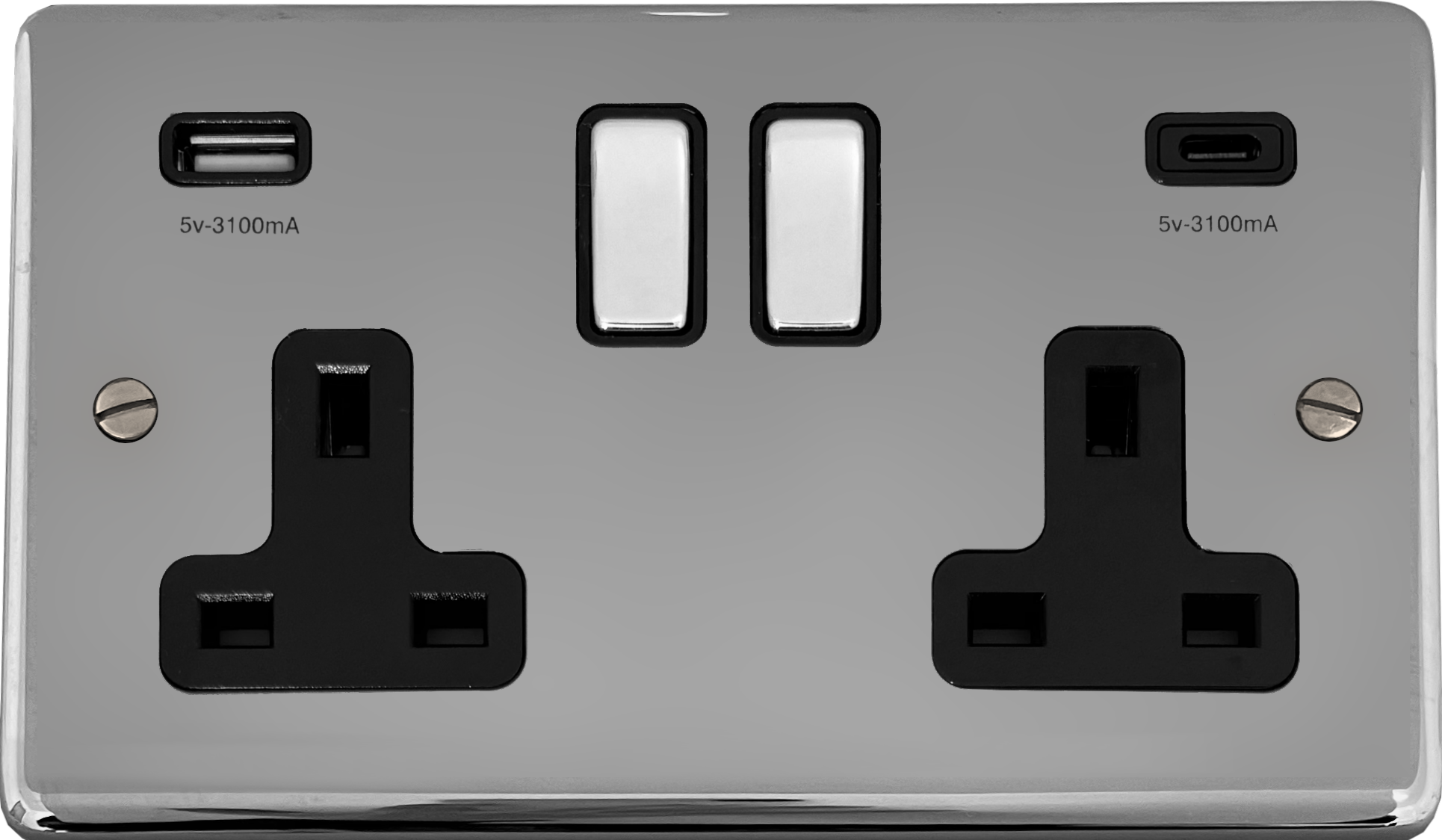 Polished Chrome Double Socket with USB (2 Gang/USB-A and USB-C/Black Insert/Chrome Switch) - CC3911