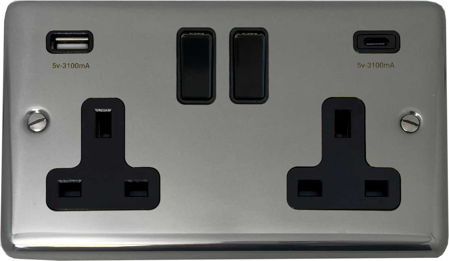 Polished Steel Double Socket with USB (2 Gang/USB-A and USB-C/Black Switches) CL.911B.PS