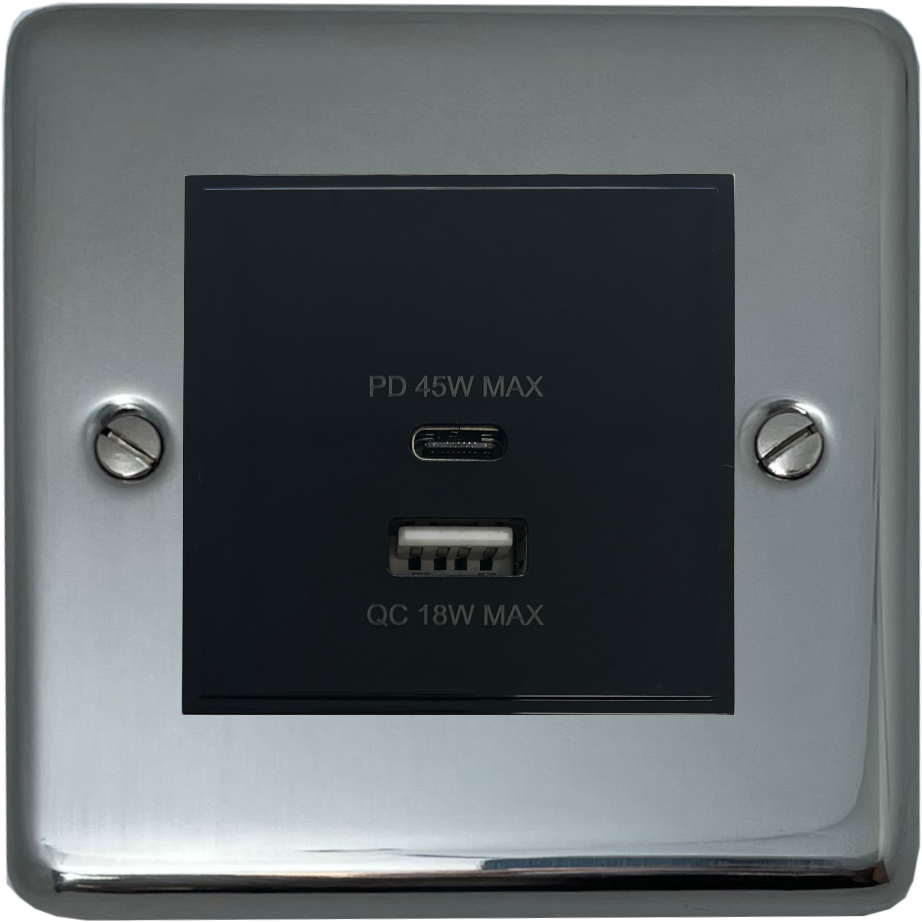 Polished Steel USB Charger (Dual USB A + C Quick Charge) (1 Gang/Black Insert) CL.43B.PS