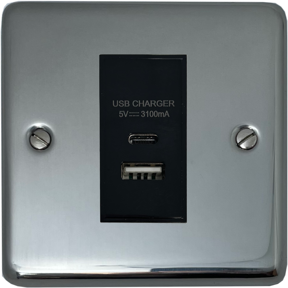Polished Steel USB Charger (USB-A and USB-C) (1 Gang/Black Insert) - CPS41B