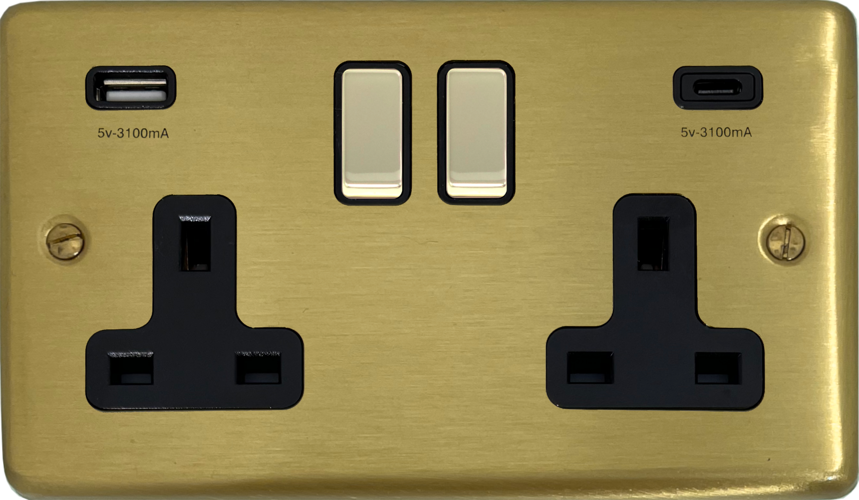 Satin Brass Double Socket with USB (USB-A and USB-C/Black Inserts Brass Switches) - CSB3911