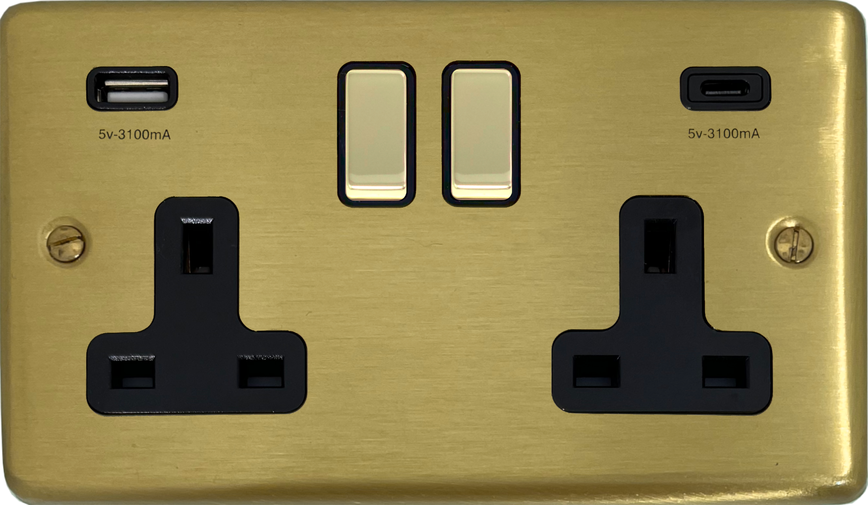 Satin Brass Double Socket with USB (USB-A and USB-C/Black Inserts Brass Switches) CL.3911.SB