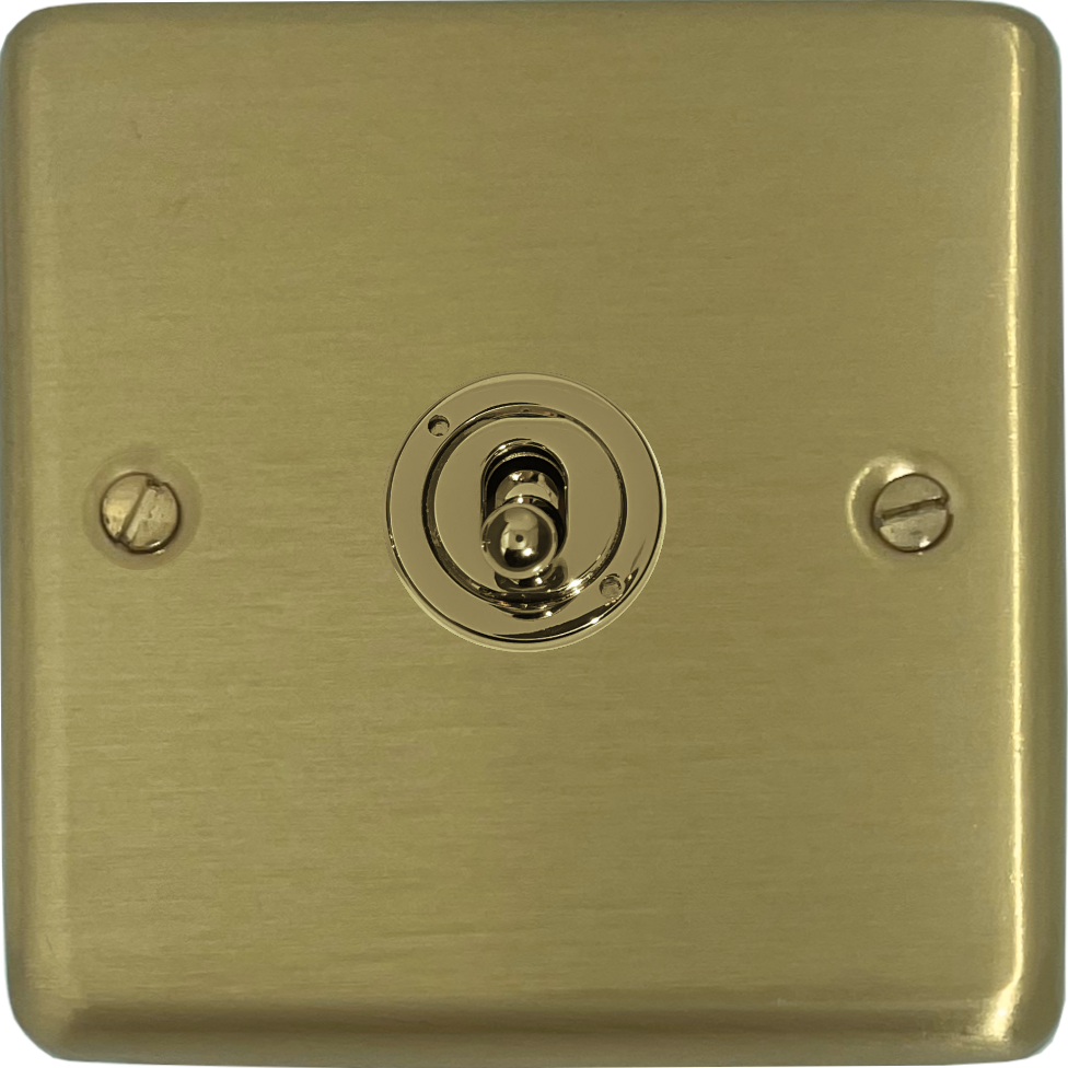 This is a one gang satin brass toggle switch from G+H Electrical Accessories.