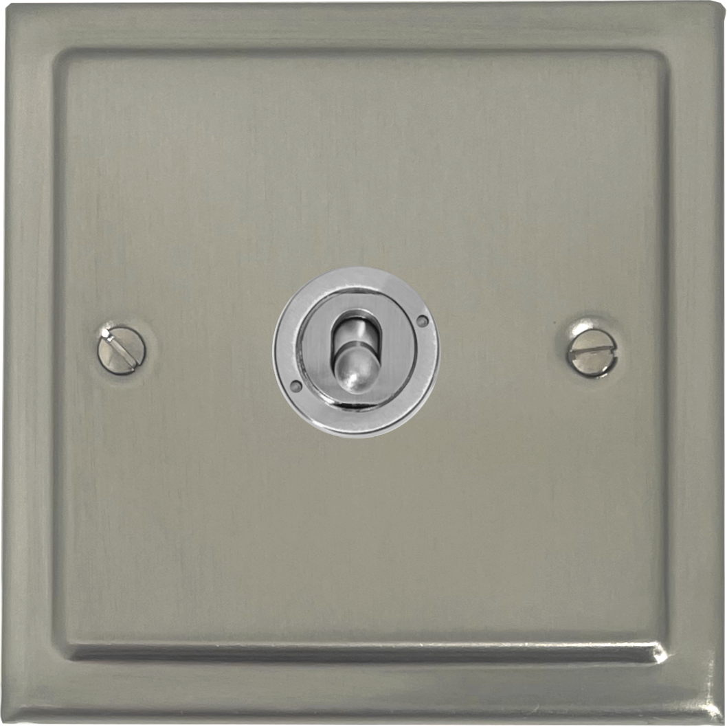 This is a single satin nickel intermediate toggle switch. It is a single switch on a satin nickel single switch plate.