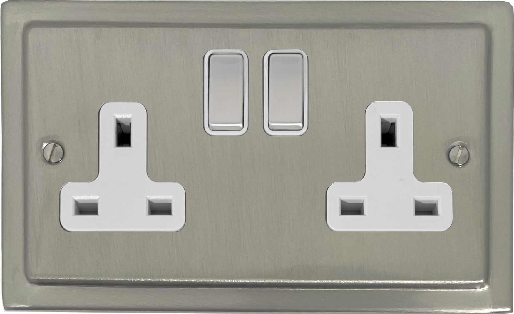 It is a two gang 13 amp DP socket. It is fixed to a satin nickel plate. The switches are metal switches with white plastic surrounds.