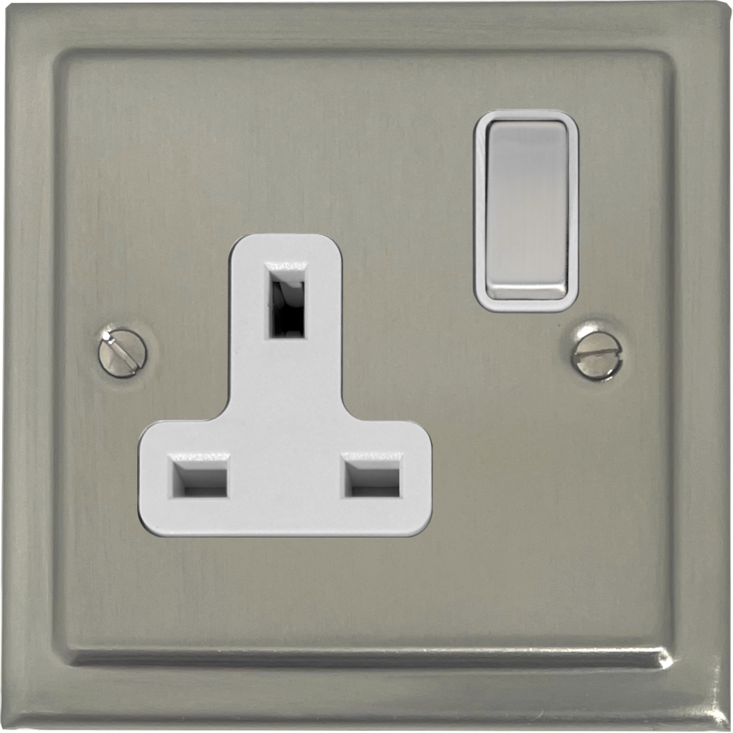 It is a metal socket plate with a satin nickel finish. It has a metal switch with a white surround. The socket is a 13 amp DP socket.