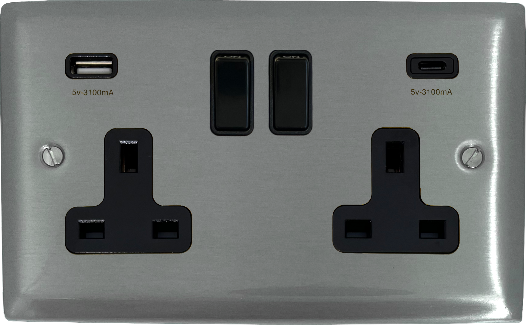 Spectrum Brushed Steel Double Socket with USB (USB-A and USB-C/Black Switches) - SSS911B