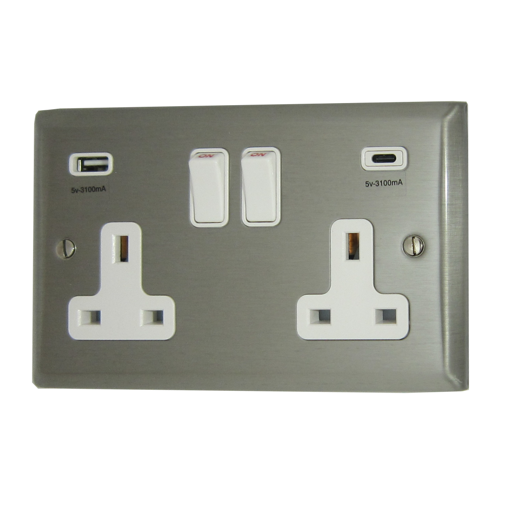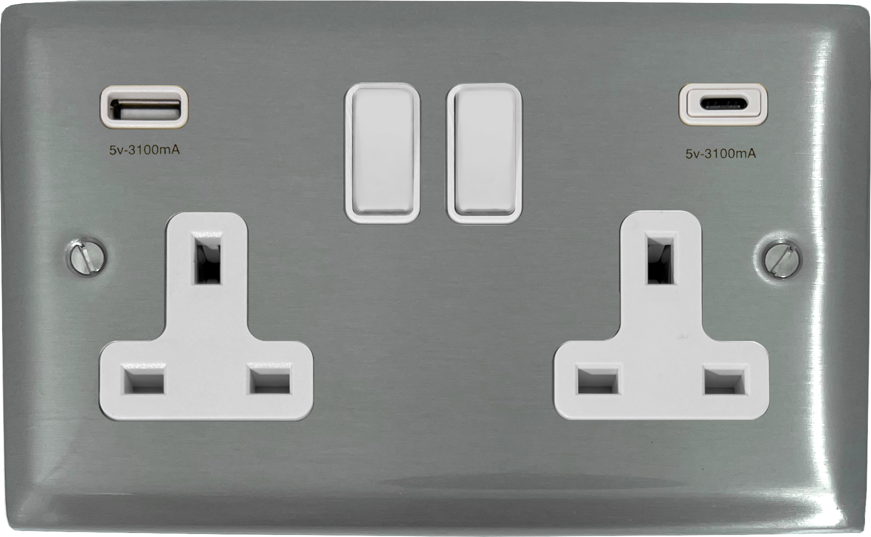 Spectrum Brushed Steel Double Socket with USB (USB-A and USB-C/White Switches) - SSS911W