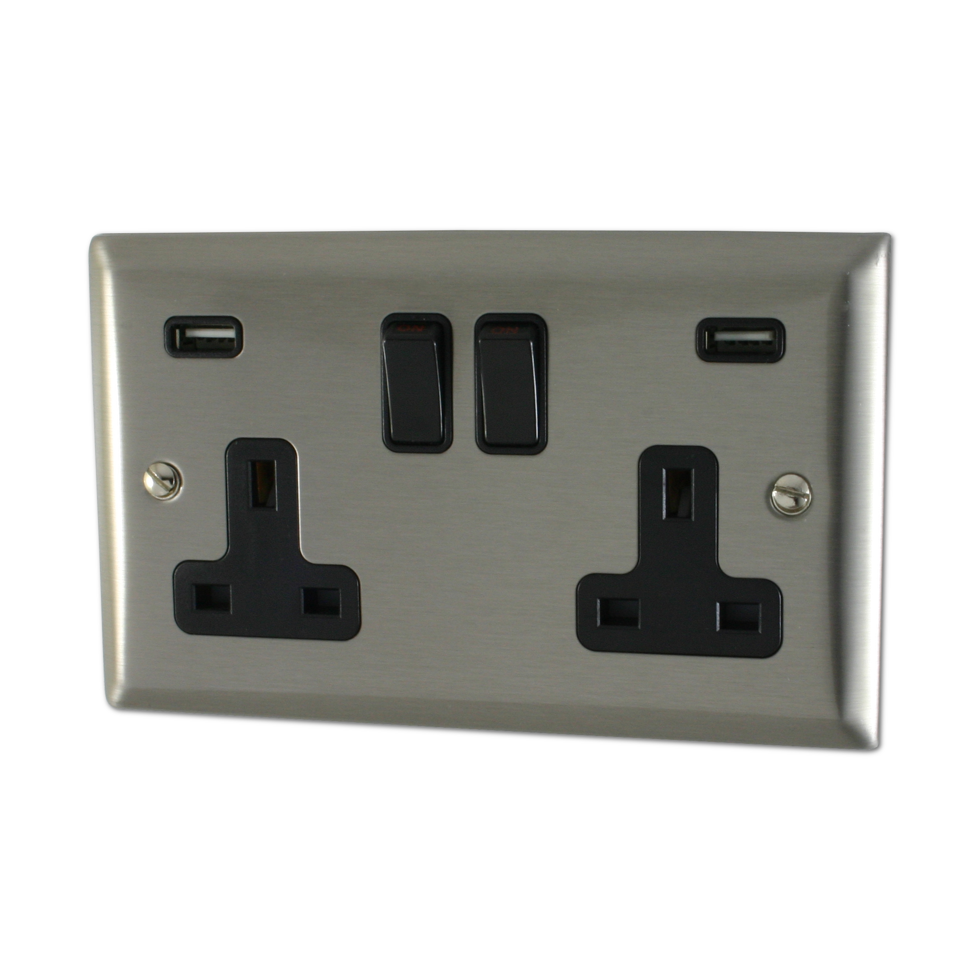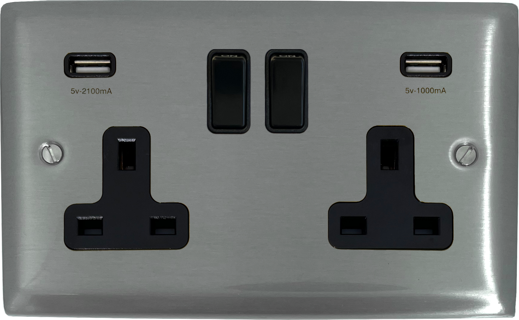 Spectrum Brushed Steel Socket with USB (2 Gang/Black Switches) - SSS910B