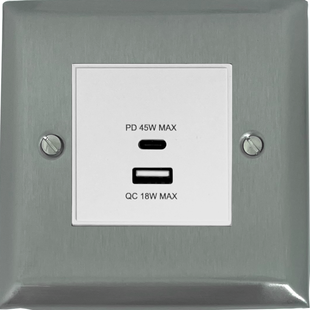 Spectrum Brushed Steel USB Charger (Dual USB A + C Quick Charge) (1Gang/White Insert) - SSS43W