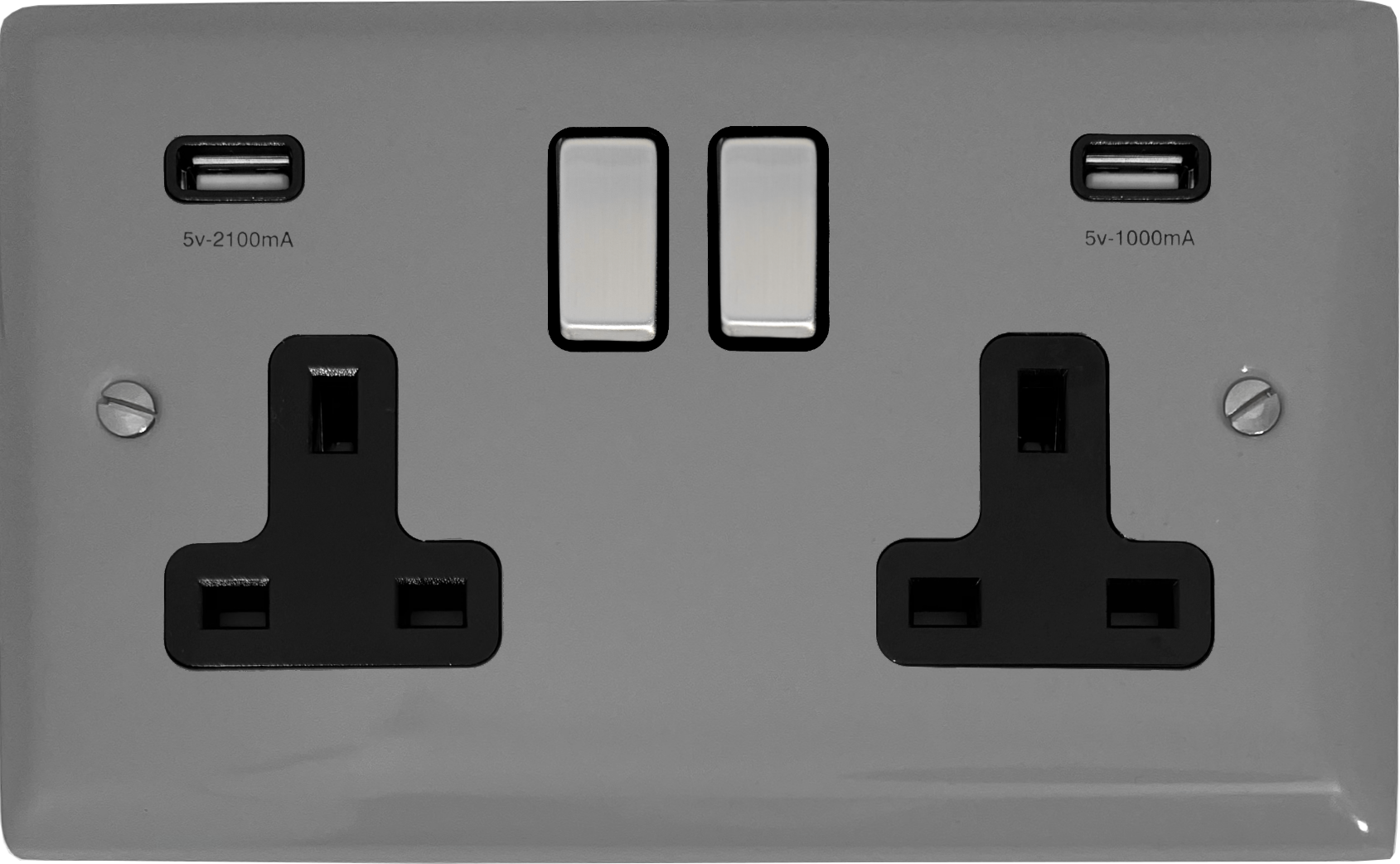 Spectrum Light Grey Double Socket with USB (Black insert/Metal Switches) EL.3910.LG