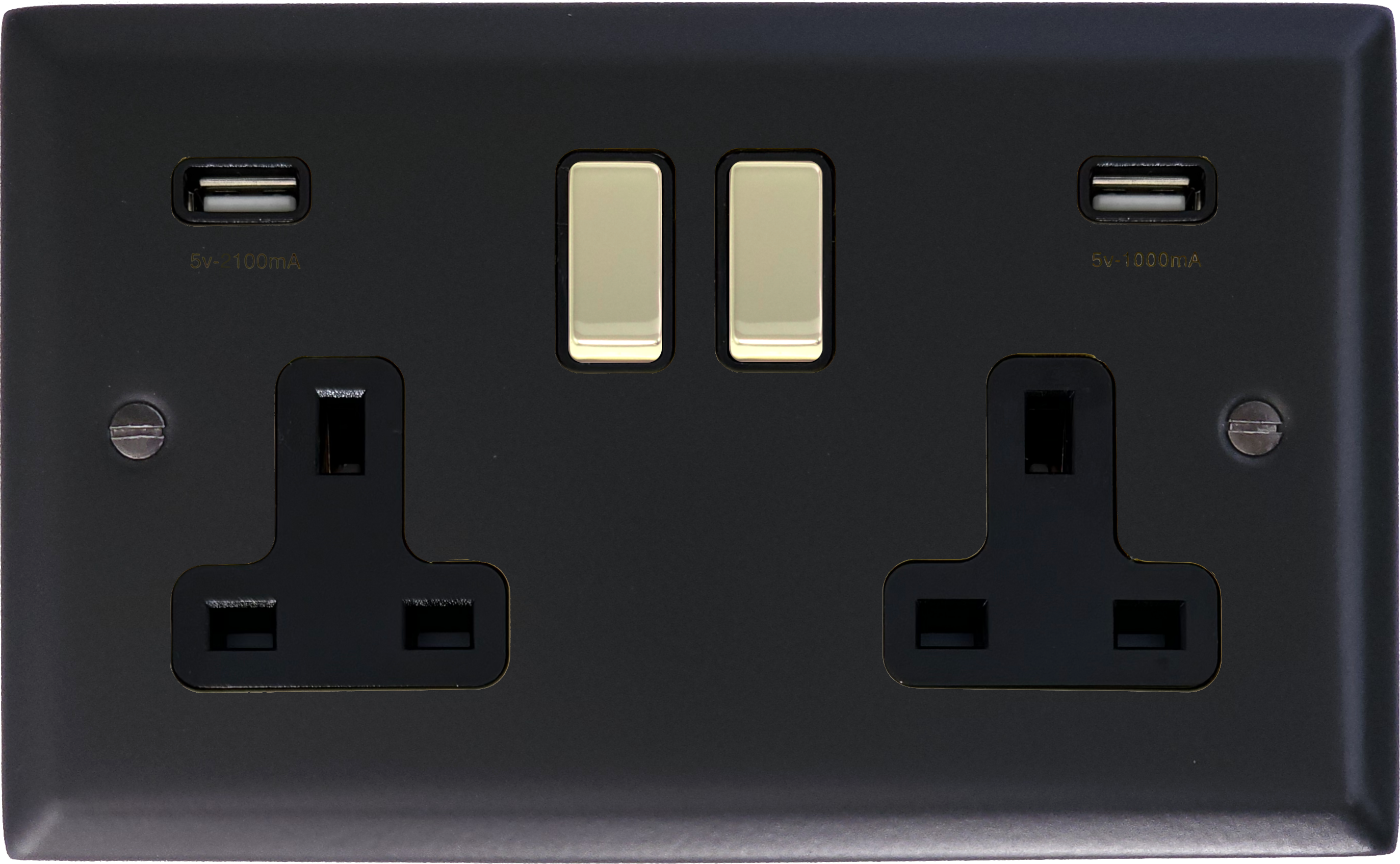 Spectrum Matt Black Double Socket with USB (Polished Brass Switches) - SFB3910-PB