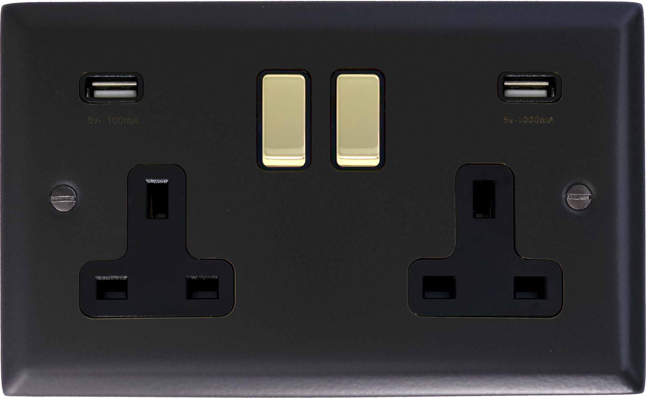 Spectrum Matt Black Double Socket with USB (Polished Brass Switches) EL.3910PB.FB