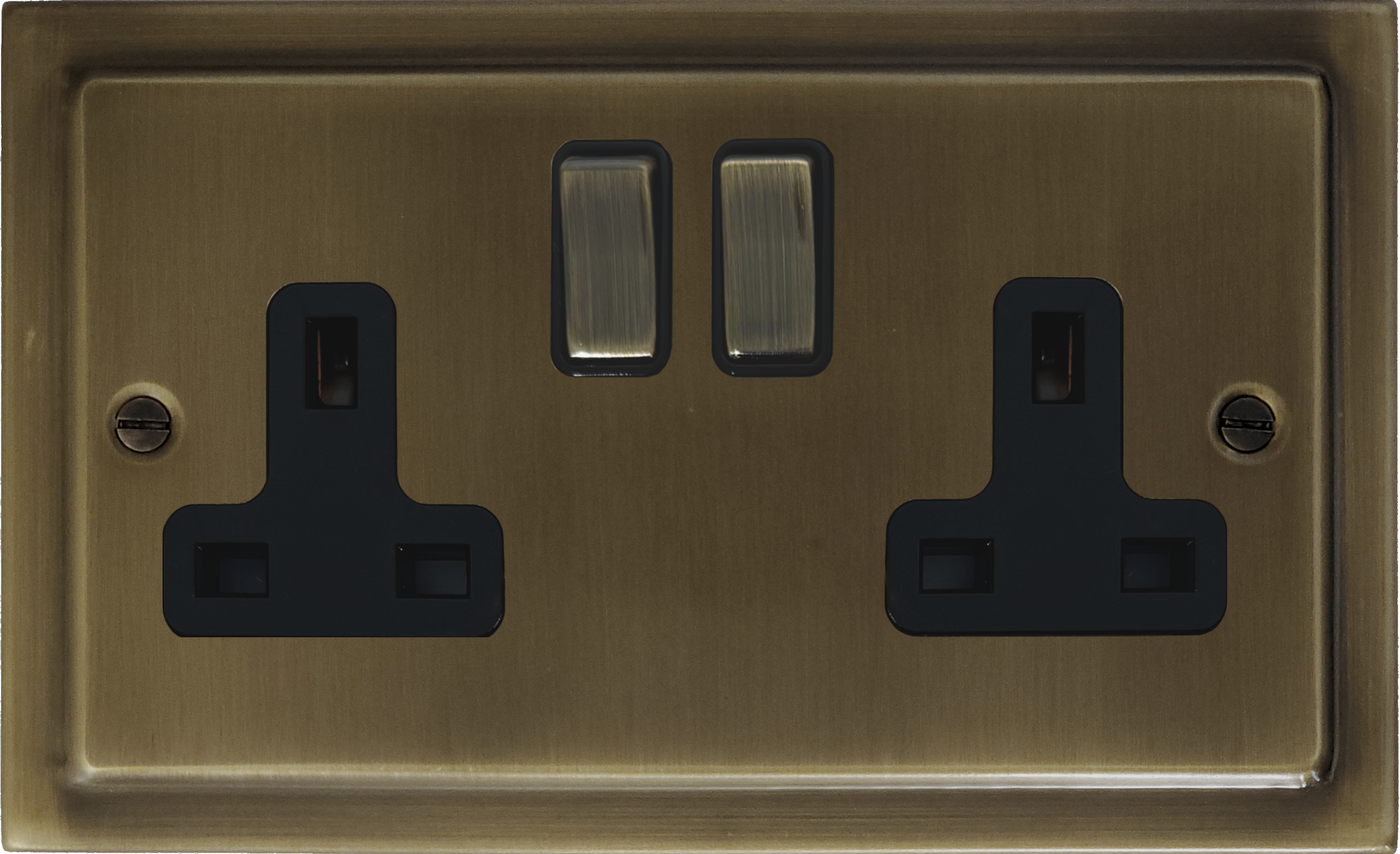 It is a metal double socket with metal switches in matching antique brass. All plates are manufactured in the UK to BS standards and come with a 10 years' warranty.