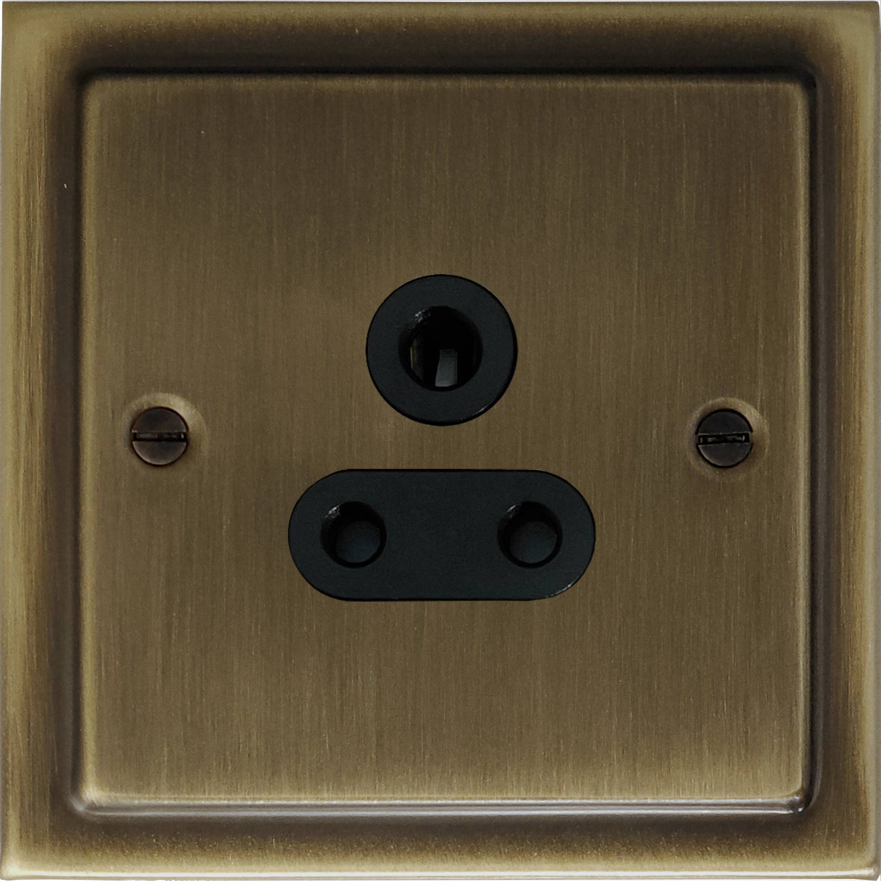 It is an unswitched socket with three round pins, usually used for lighting (such as table lamps). It has a Victorian antique brass single socket plate. The socket inserts are made of black plastic.