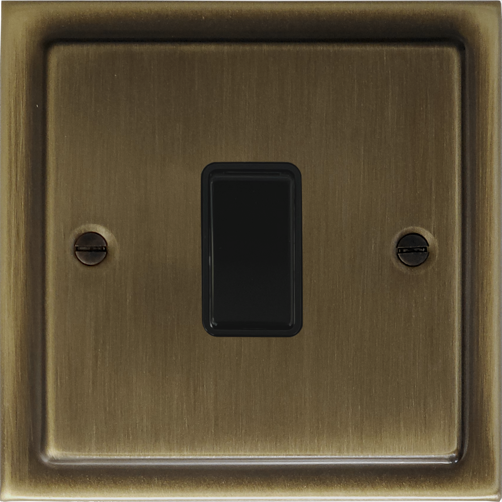 It is an antique brass finish light switch on a Victorian light switch plate. It has a black plastic rocker switch. It is part of the G+H Electrical Accessories range of plates.