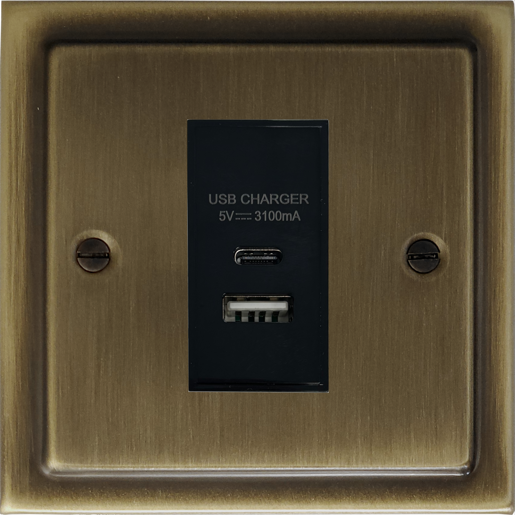 Victorian Antique Brass USB Charger (USB-A and USB-C) (1 Gang) - TAB41B
