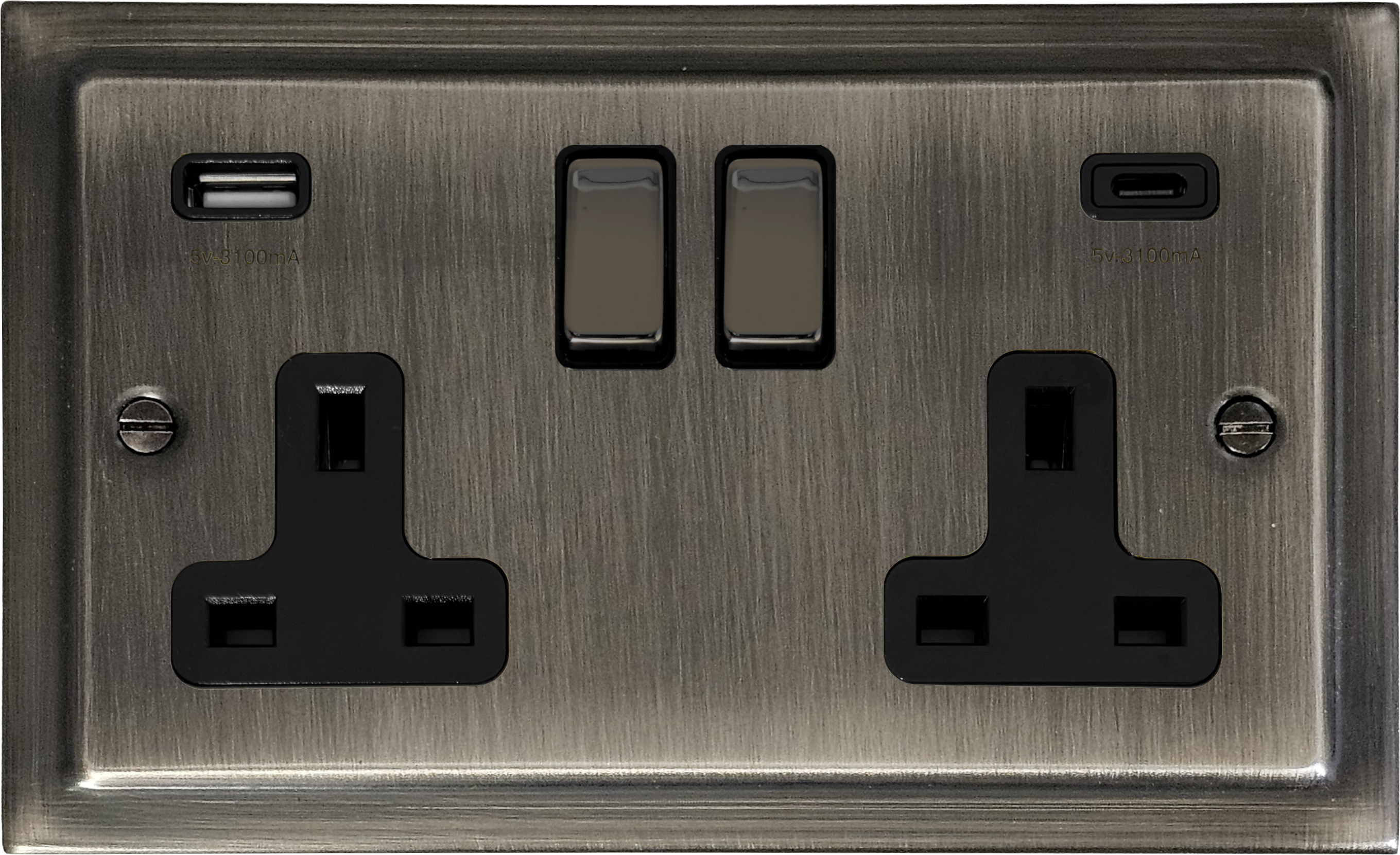 Victorian Antique Nickel Double Socket with USB A&C (Black Inserts/Black Nickel Switches) VI.3911.NA