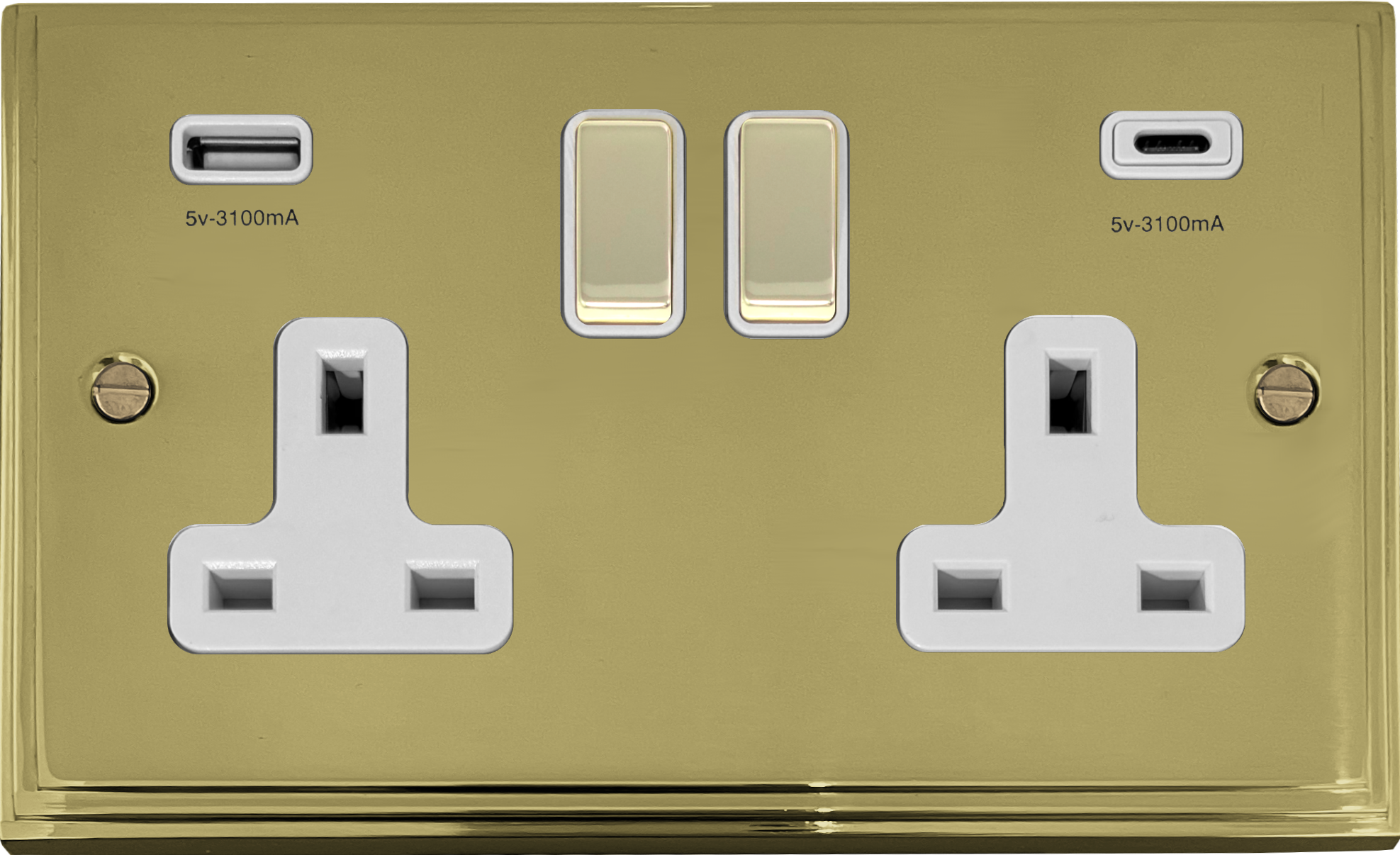 Victorian Cast Polished Brass Double Socket with USB (USB-A and USB-C/White Inserts Brass Switches) - VB2911