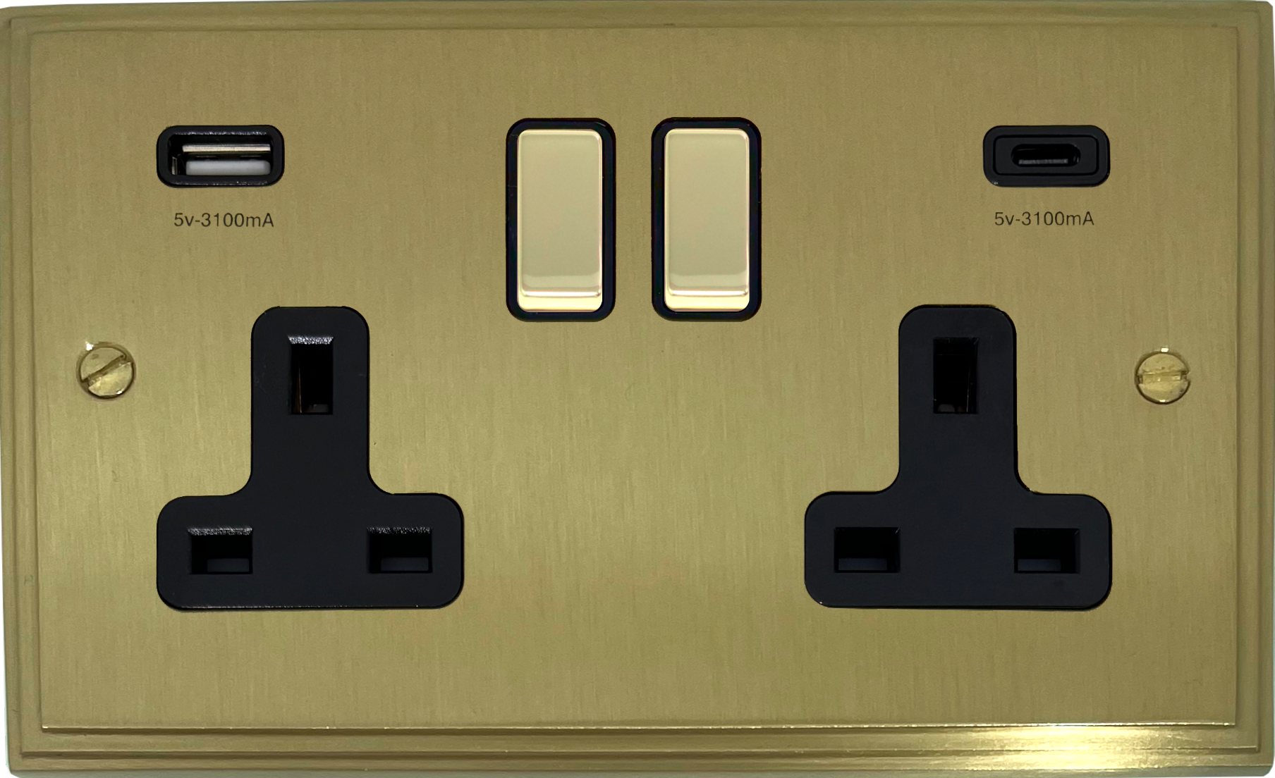Victorian Cast Satin Brass Double Socket with USB (USB-A and USB-C/Black Switches) VC.3911.SB