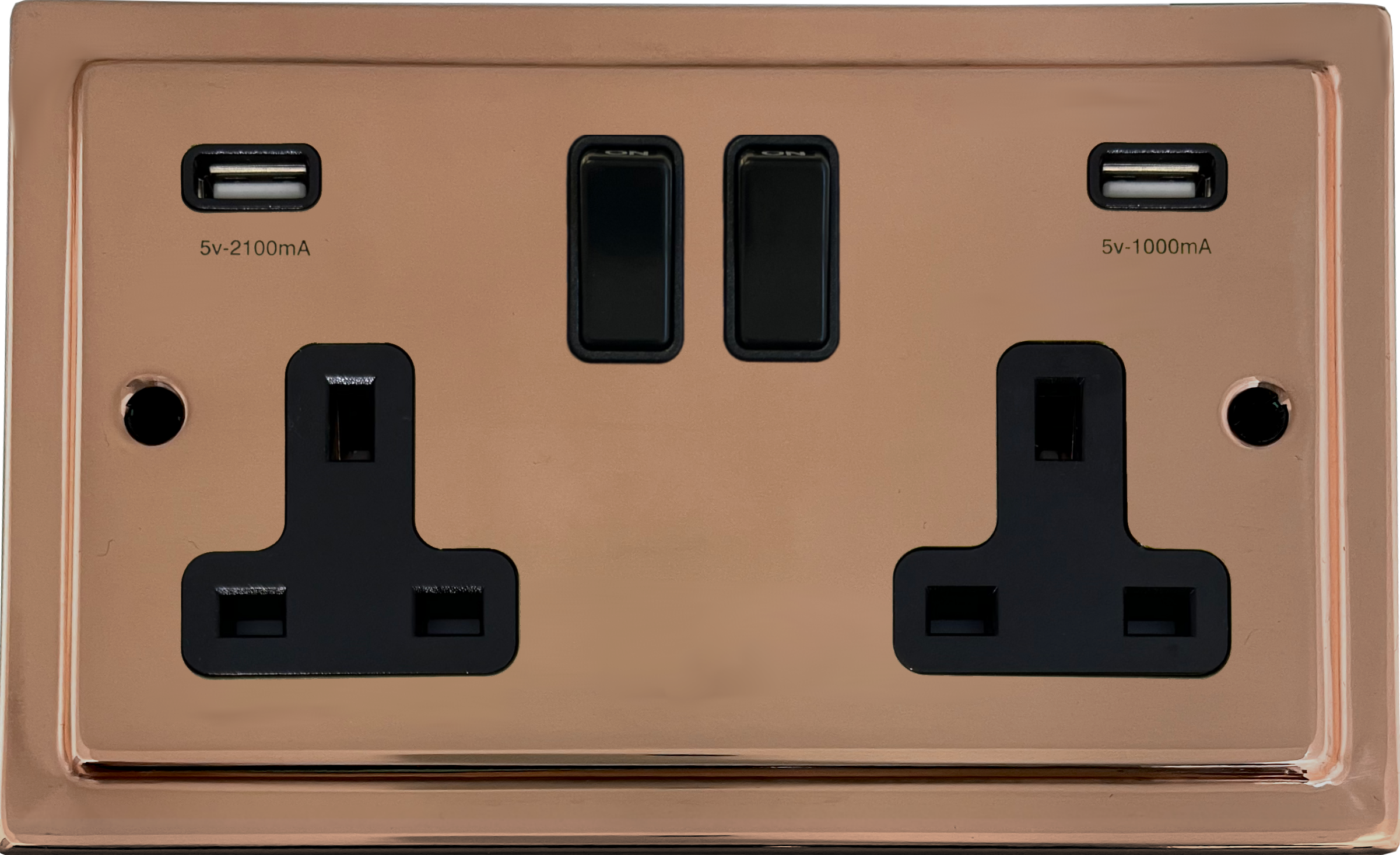 Victorian Copper Double Socket with USB (Black Switch) - TBC910B