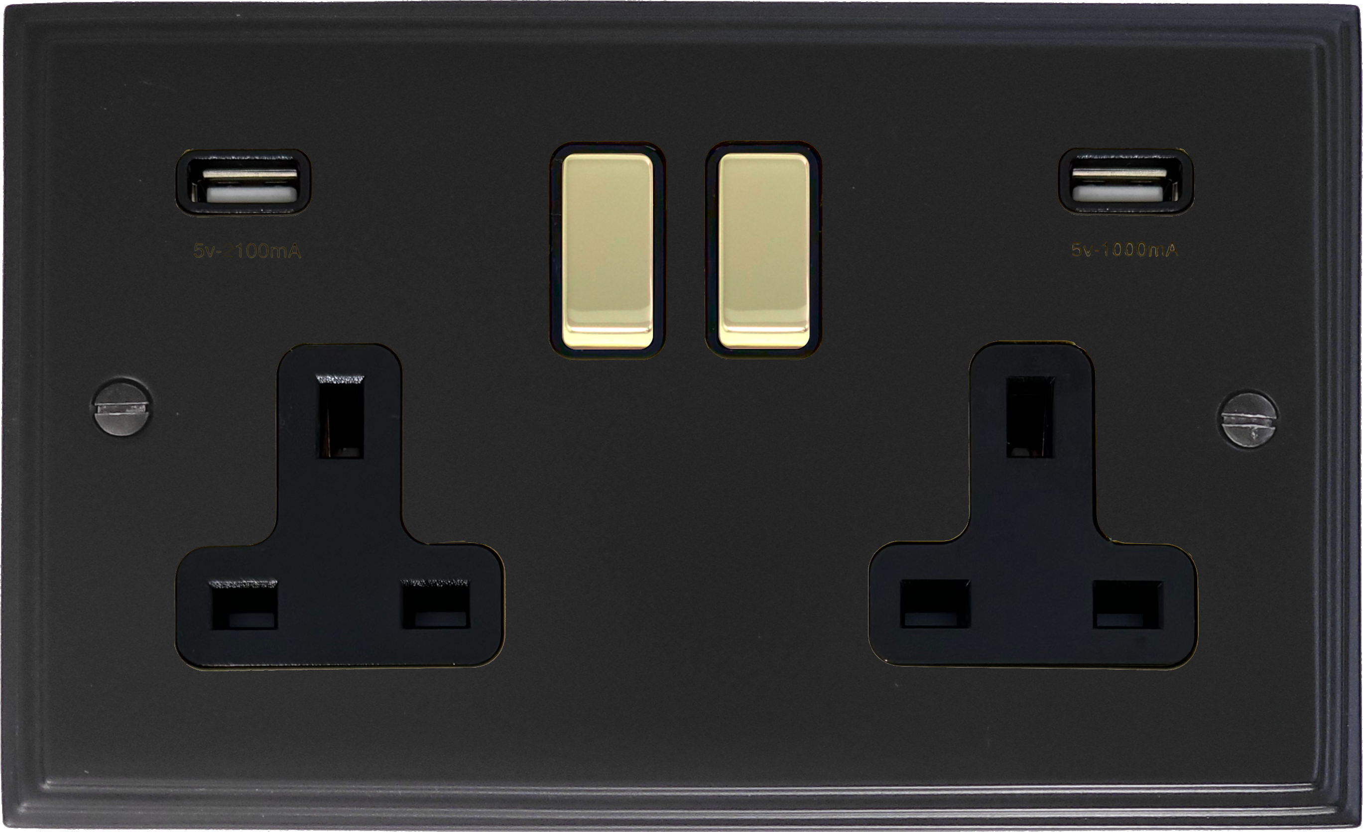 Victorian Matt Black Double Socket with USB (Polished Brass Switches) VC.3910PB.FB