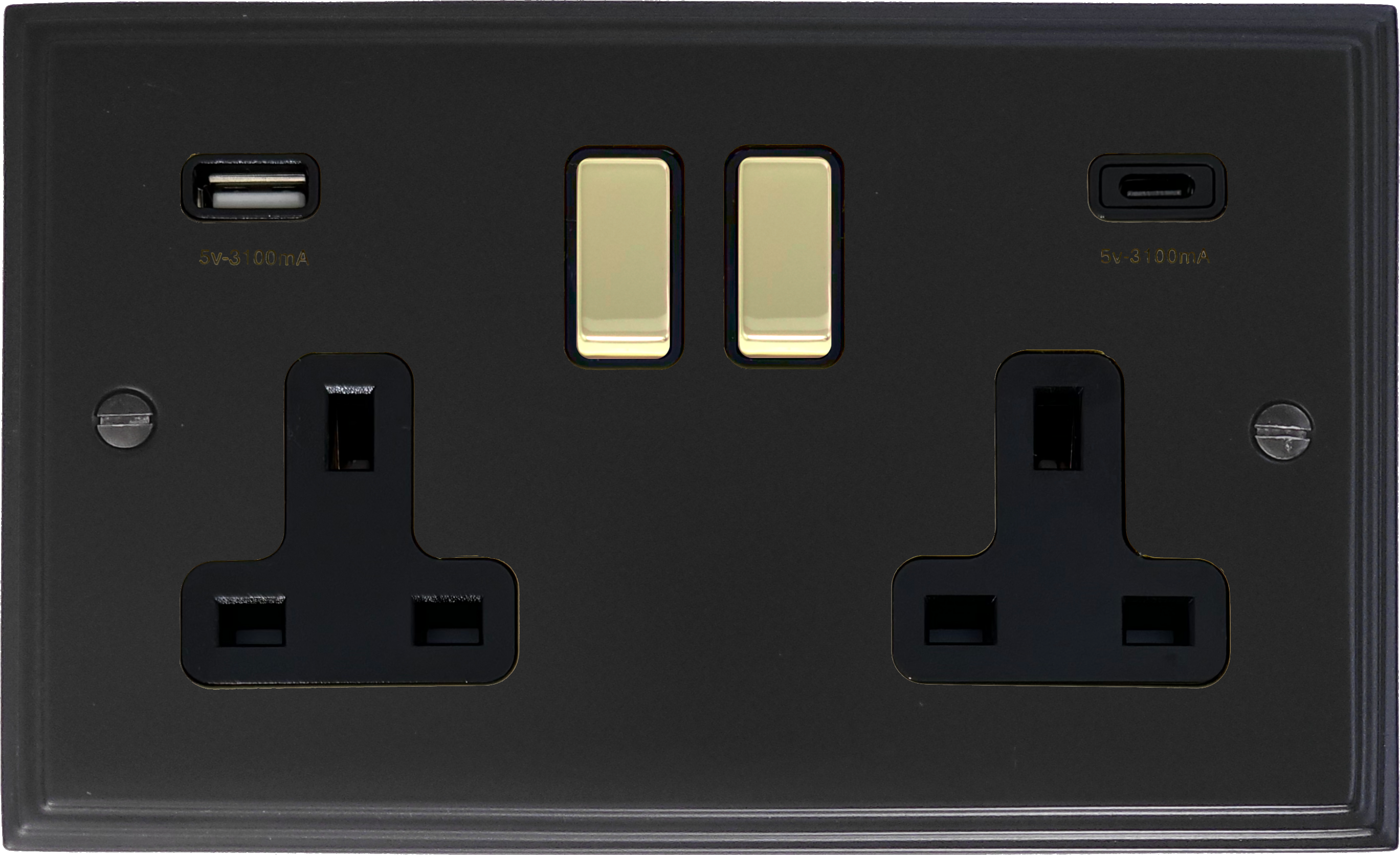 Victorian Matt Black Double Socket with USB (USB-A and USB-C/Polished Brass Switches) VC.3911PB.FB