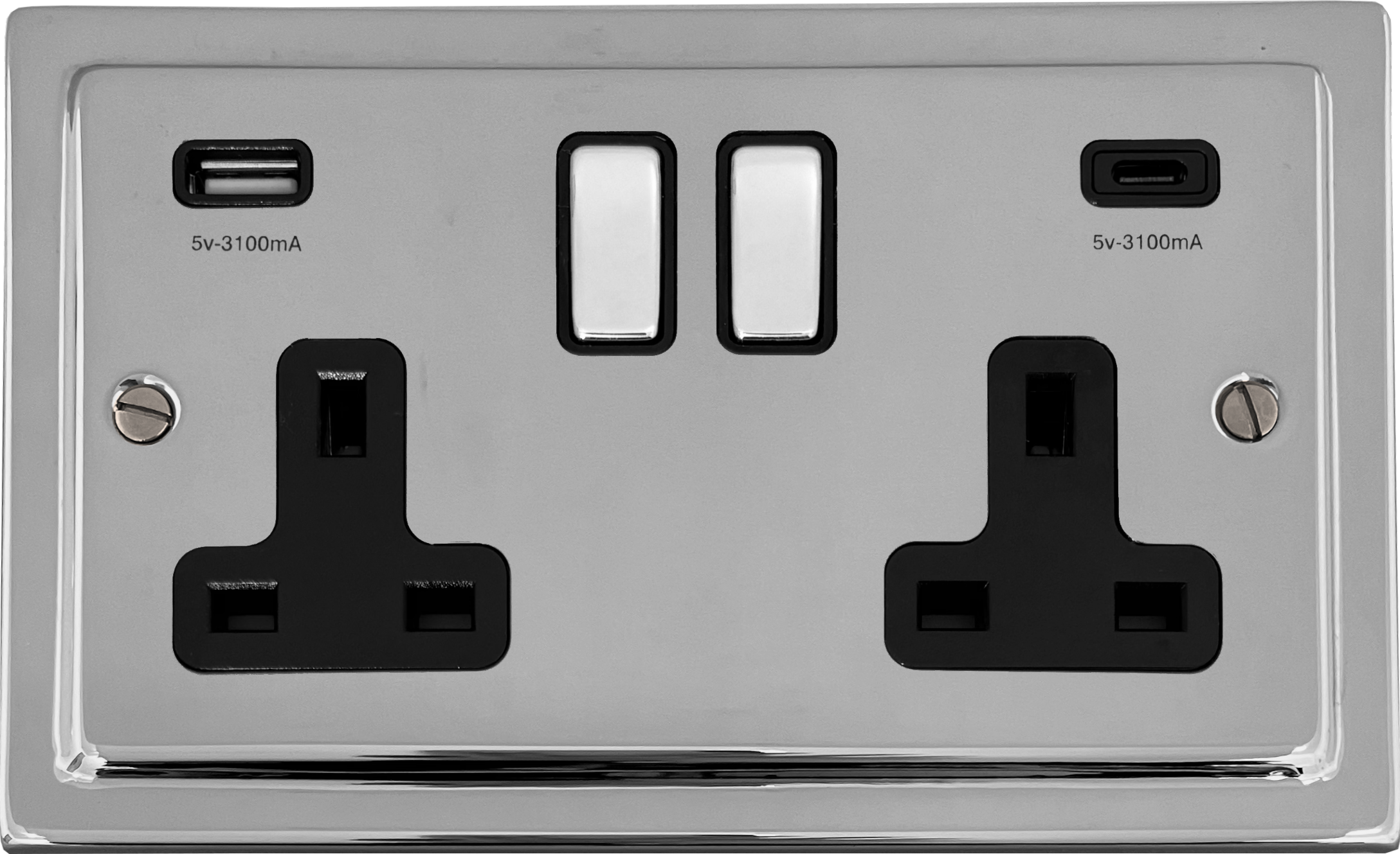Victorian Polished Chrome Double Socket with USB (USB-A and USB-C/Black Inserts/Chrome Switches) VI.3911.C