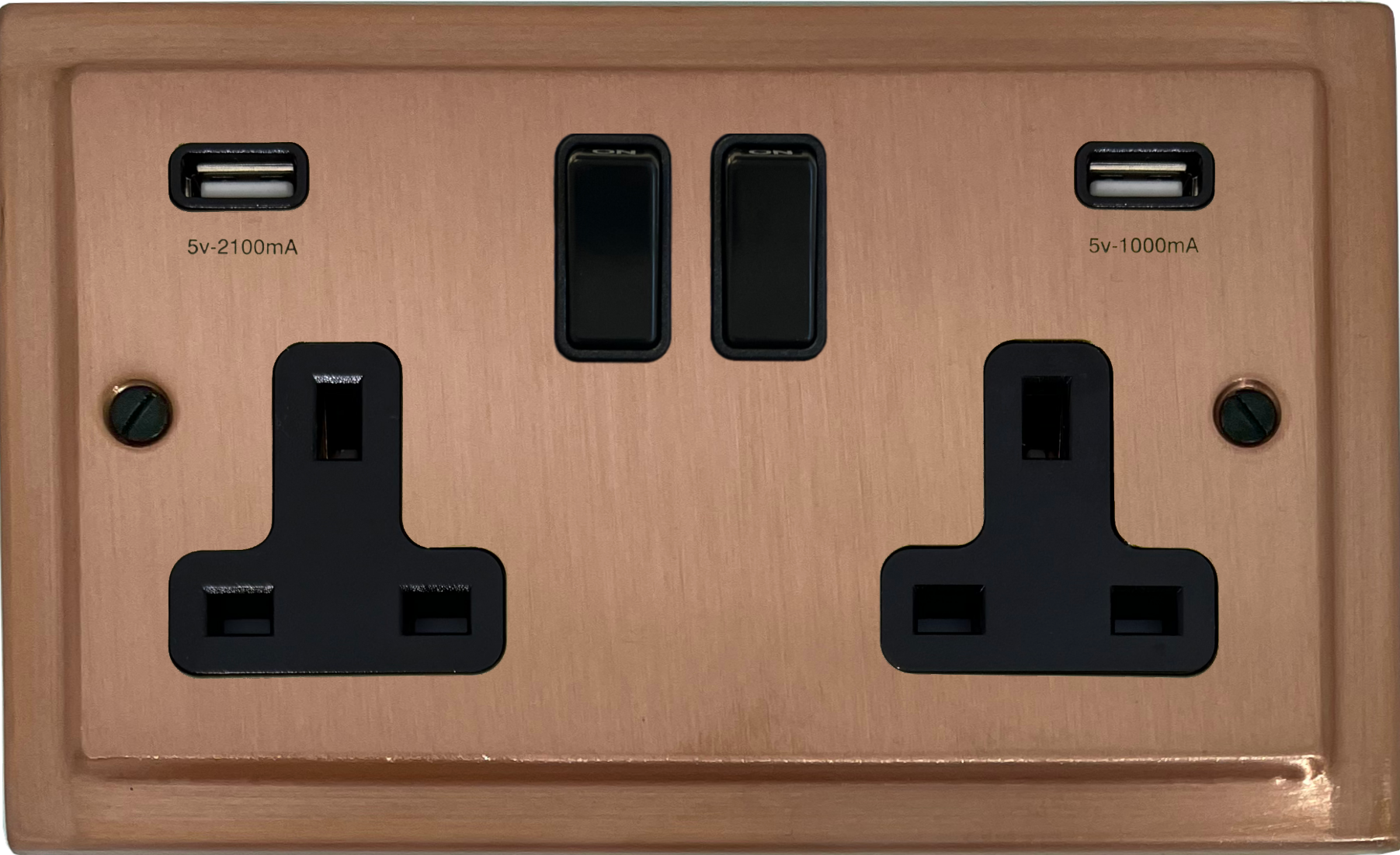 Victorian Rose Gold Double Socket with USB (Black Switch) - TRG910B