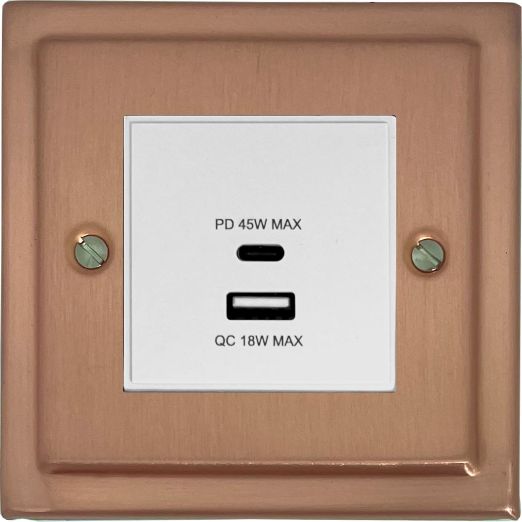 Victorian Rose Gold USB Charger (Dual USB A + C Quick Charge) (1 Gang/White Insert) VI.43W.RG