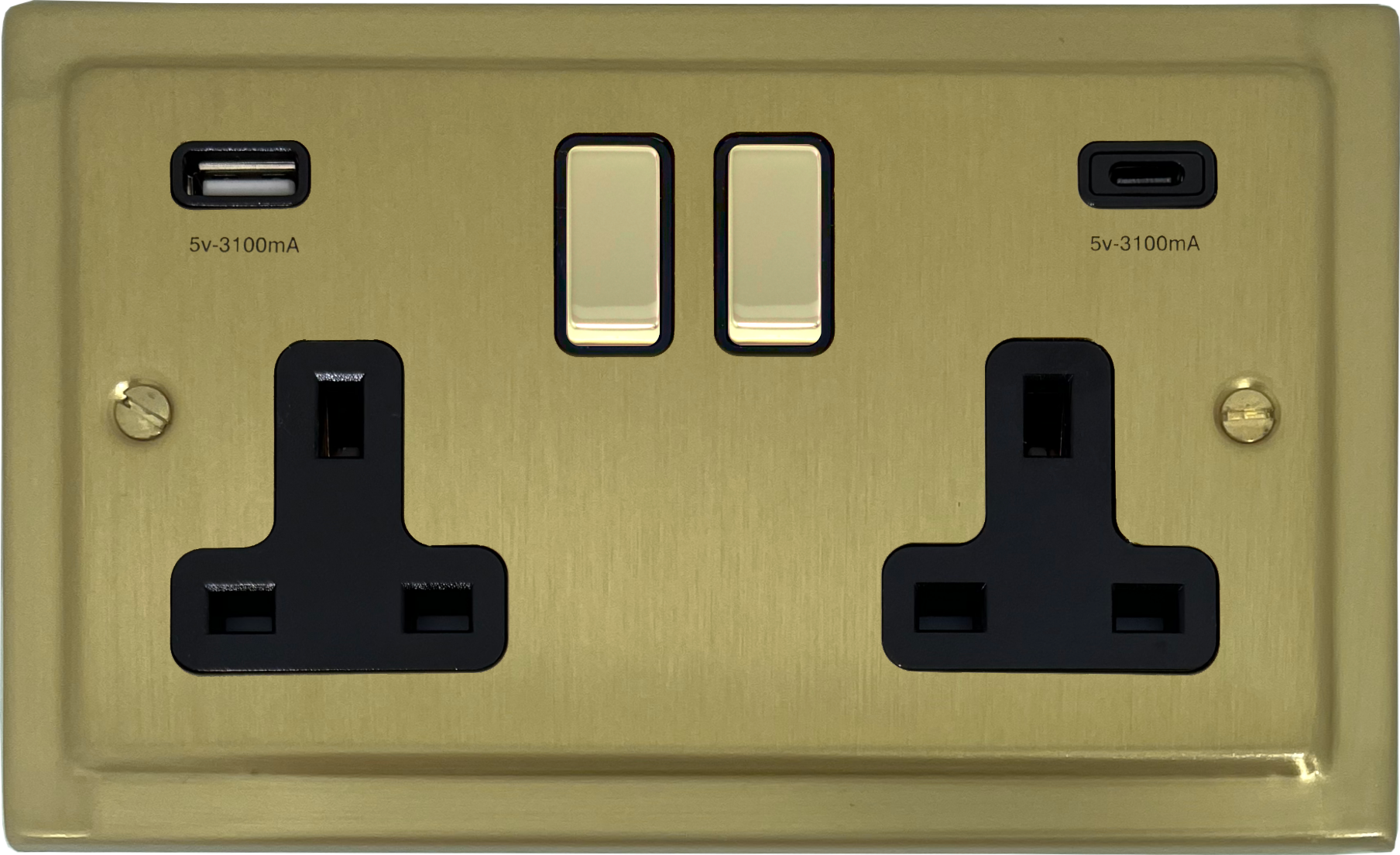 Victorian Satin Brass Double Socket with USB (USB-A and USB-C/Black Inserts/Brass Switches) VI.3911.SB