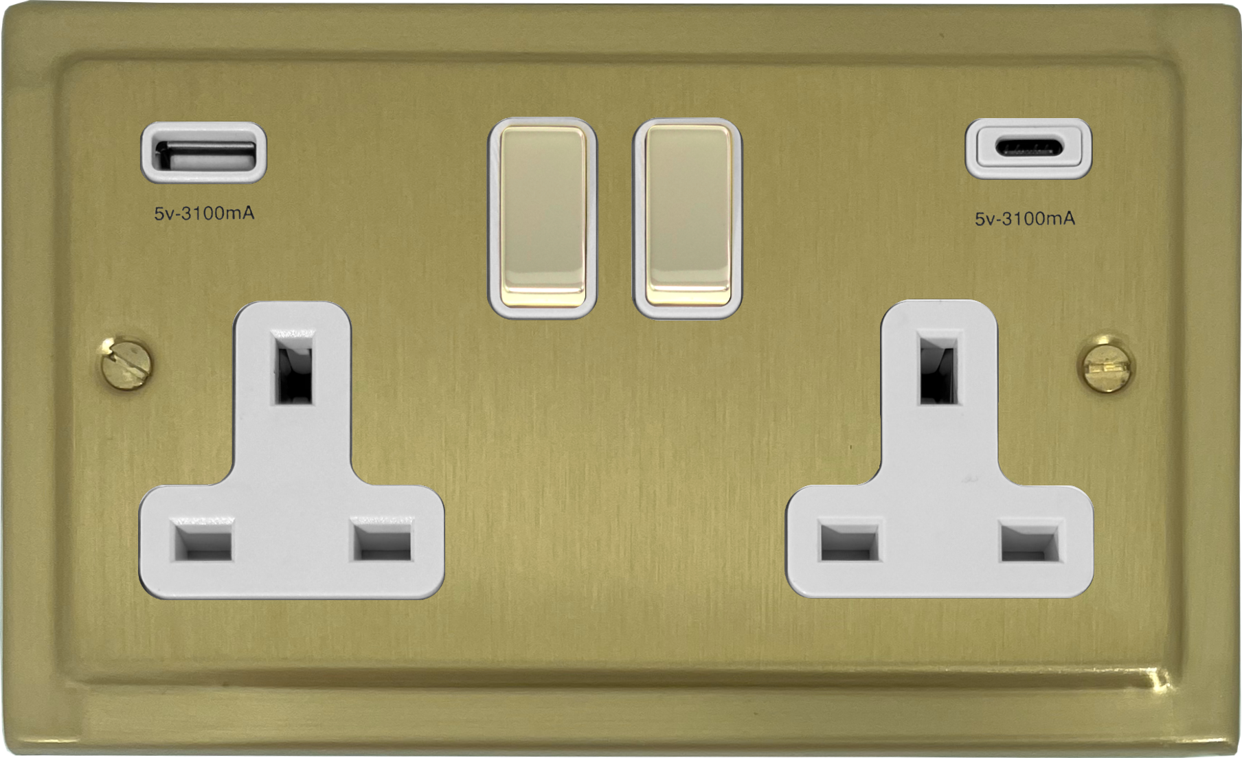 Victorian Satin Brass Double Socket with USB (USB-A and USB-C/White Inserts/Brass Switches) - TSB2911