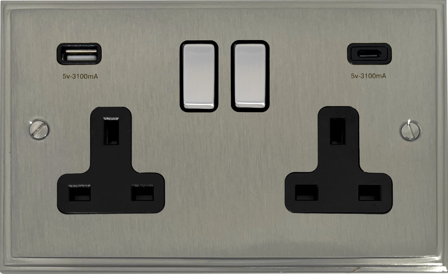 Victorian Satin Nickel Double Socket with USB (USB-A and USB-C/Black Inserts/Steel Switches) VC.3911.SN
