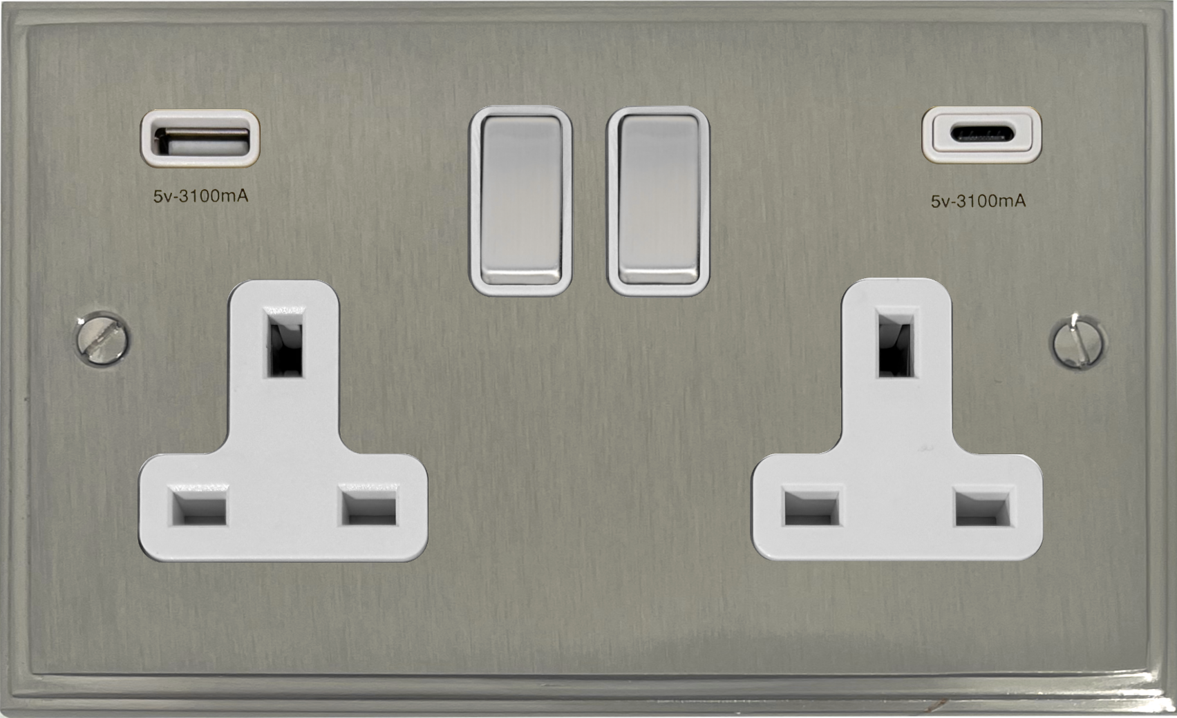 Victorian Satin Nickel Double Socket with USB (USB-A and USB-C/White Inserts/Steel Switches) VC.2911.SN
