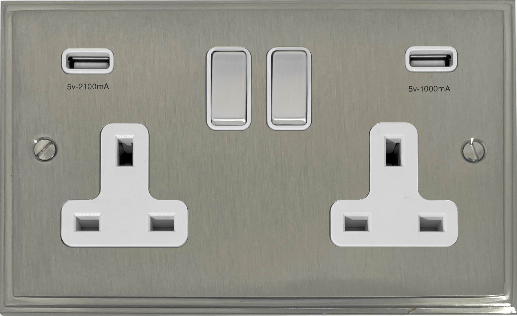 Victorian Satin Nickel Double Socket with USB (White Insert/Steel Switches) - VSN2910