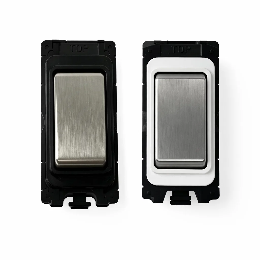Brushed Steel Grid Switch Inserts offer a sophisticated and contemporary solution for interior electrical fittings. The brushed steel finish provides a sleek and modern aesthetic, seamlessly blending into various design schemes. These grid switch inserts are not only visually appealing but also boast the practical advantage of engraving options. This feature allows users to customize each switch with labels or identifiers, contributing to a more organized and user-friendly environment. Whether used in residential or commercial settings, the combination of the brushed steel design and engraving options ensures a seamless integration of functionality and style, catering to the demands of modern interior aesthetics and user convenience alike.