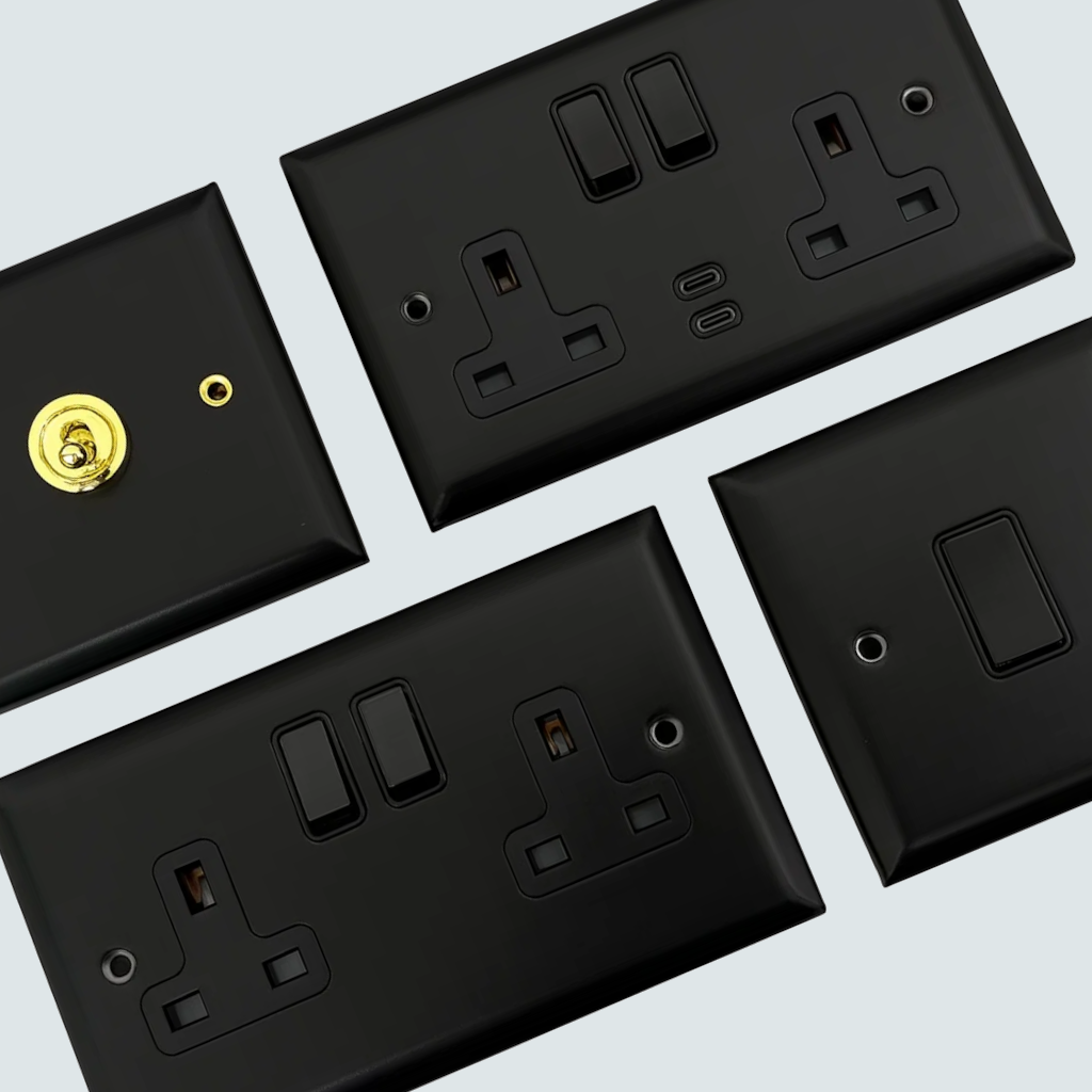 Below is the full range of Spectrum black sockets and switches in a matt black finish.