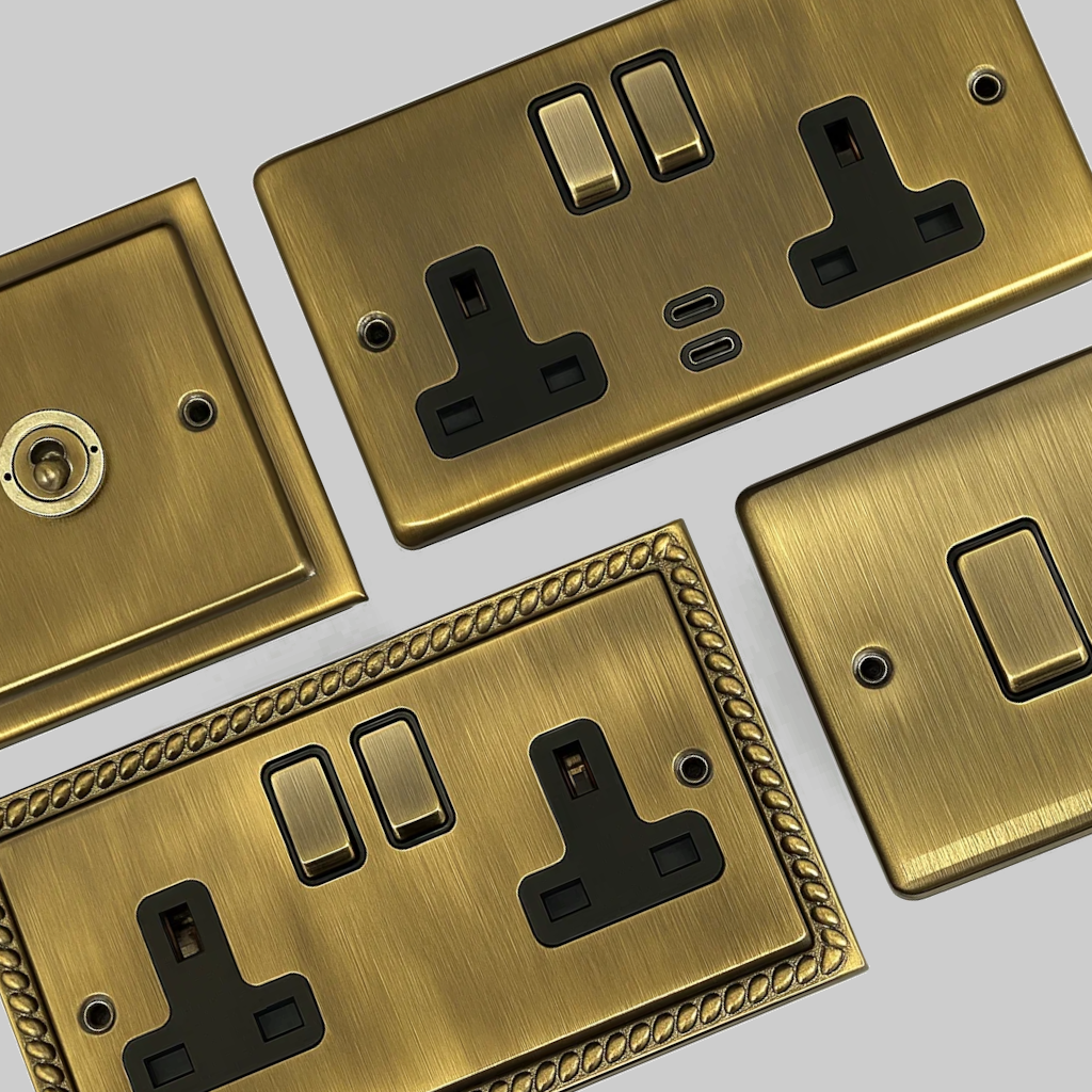 We have a huge variety of antique brass sockets and switches. The antique brass finish is a dark brass brushed effect which has a traditional look. It is available in a number of different styles, from classic Georgian and Victorian to more modern understated flat plates.