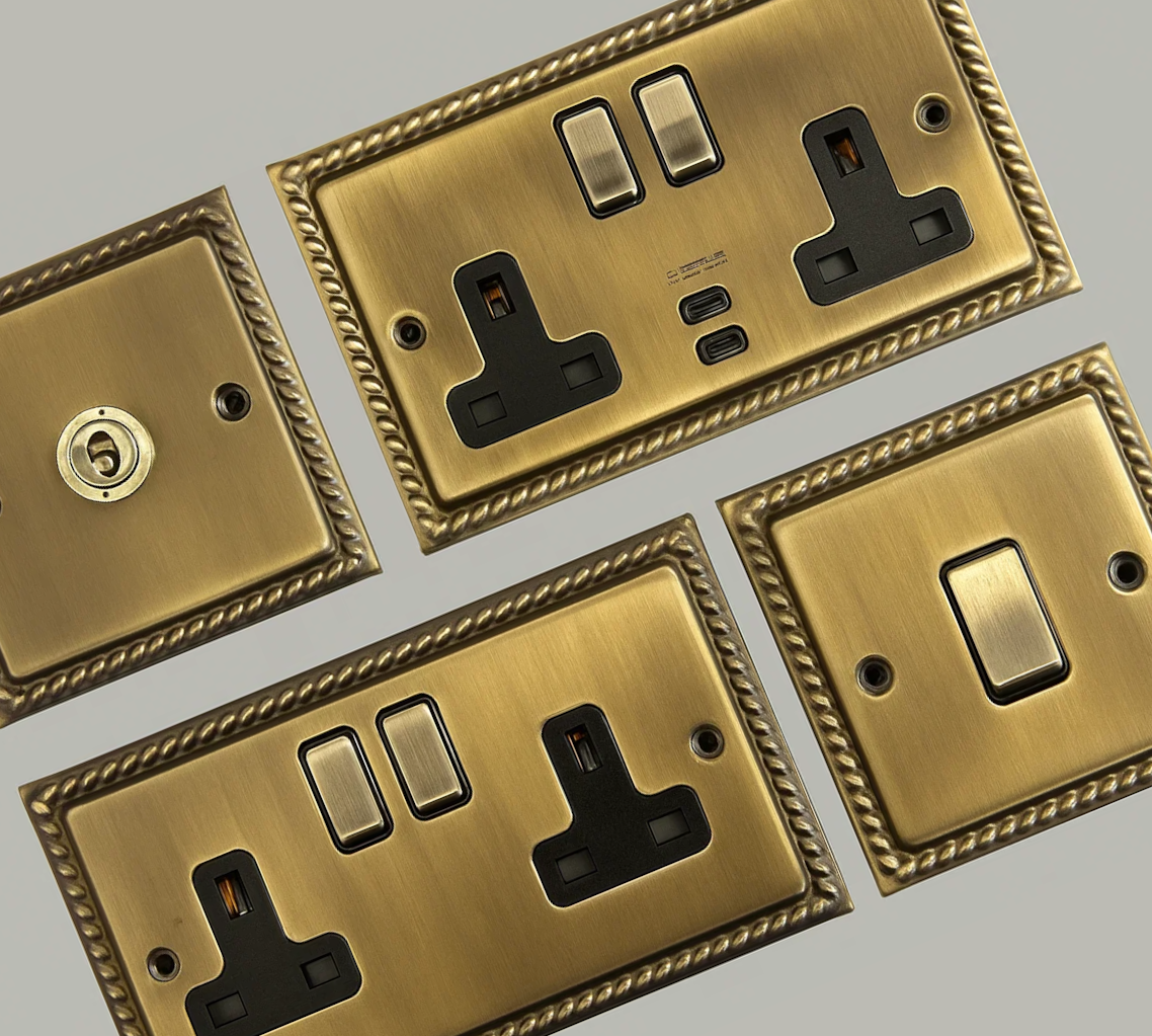 This range of sockets and switches has a rope-edge effect, giving a classic vintage design. They are available in a variety of Georgian brass sockets, switches and dimmers. Everything from toggle switches, brass dimmer switches and telephone sockets to traditional one to four gang switches.