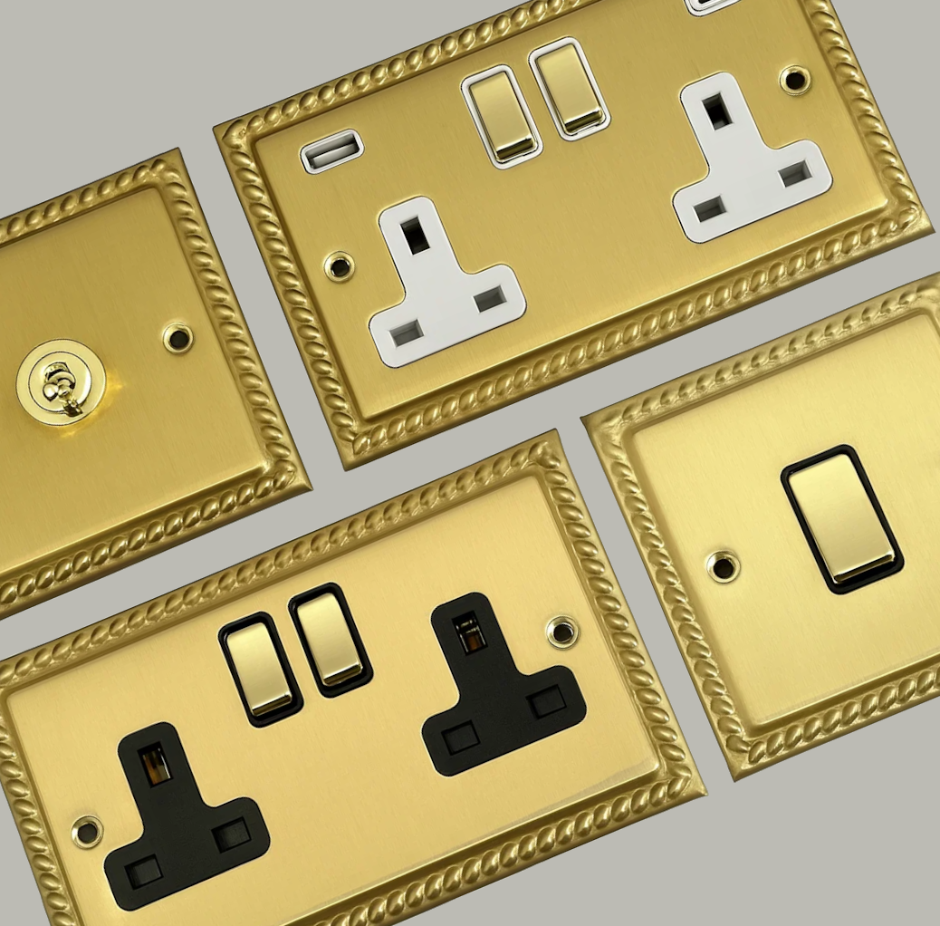 This is a range of Georgian satin brass sockets and switches with a choice of white, black or matching brass switches.
