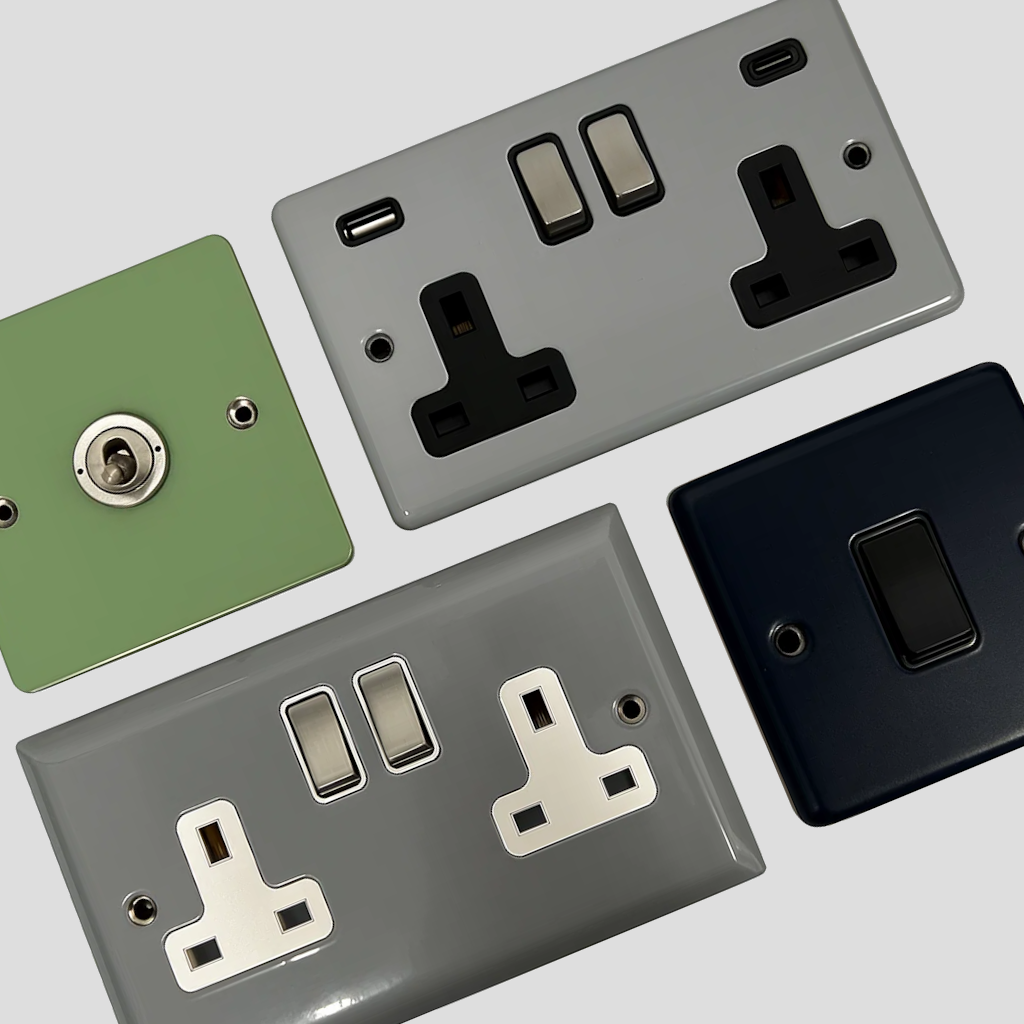 If you're looking for something a bit different we have a wide range of bright and beautiful colour options to choose from. We have a glossy pink, sage green, also a sophisticated navy blue. With a choice of switch colour options to choose from to ensure you have the perfect combination to suit your decor. Each range is available in a standard raised plate or a flat plate.