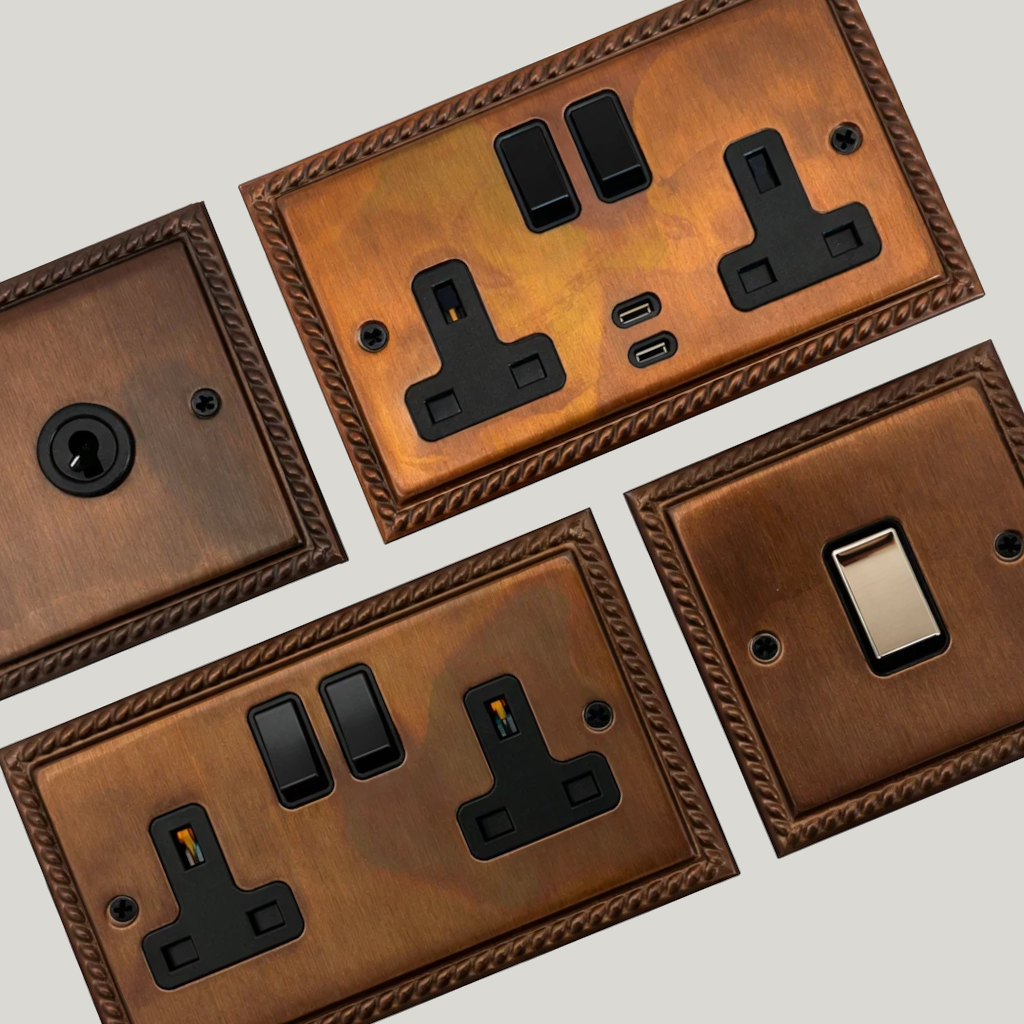 Browse through our range of Monarch tarnished copper sockets and switches, sockets and switches with beautiful roped edges.